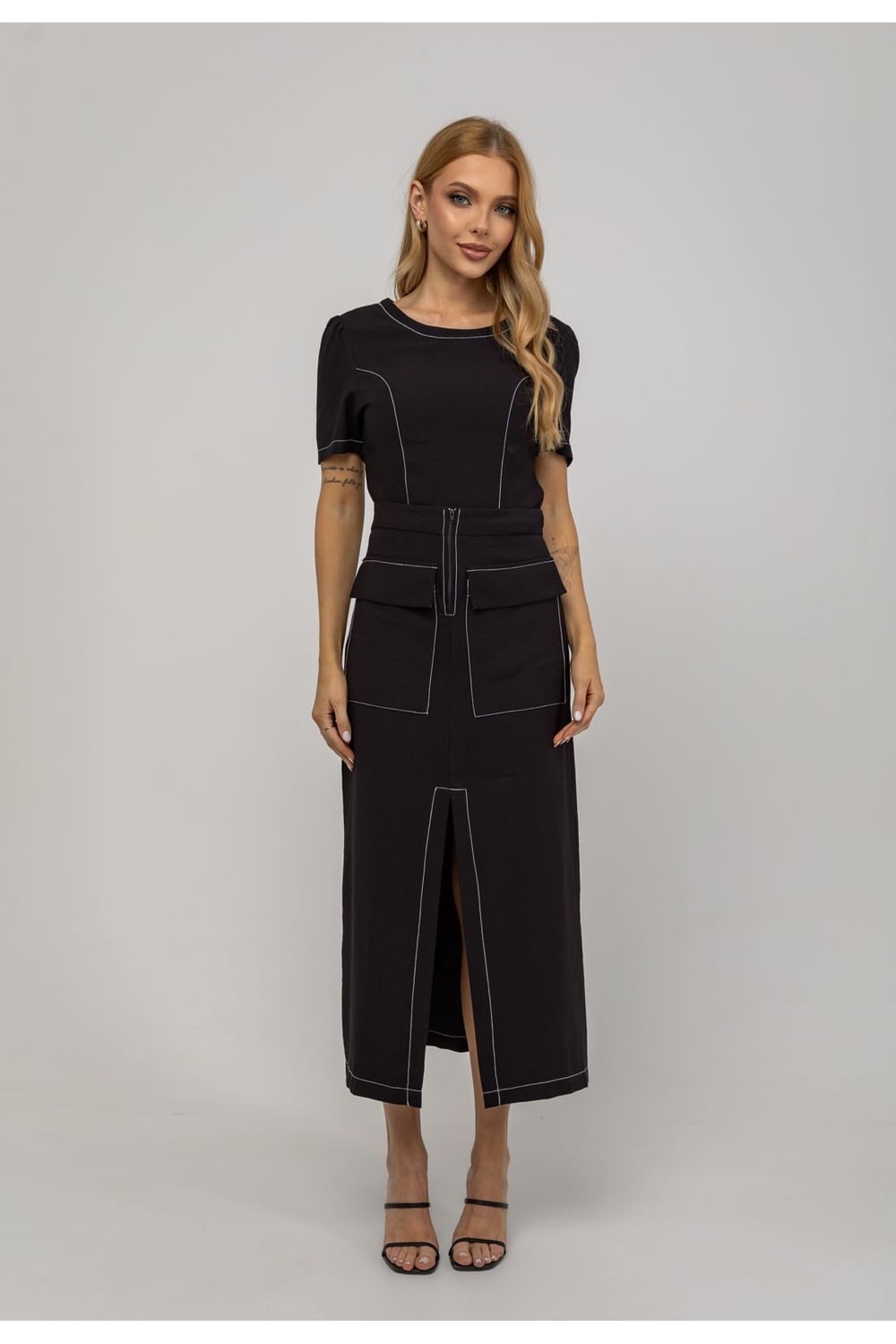 O recorte central com fenda frontal proporciona mobilidade e um toque de sensualidade discreta, equilibrando o estilo clássico com um toque contemporâneo.