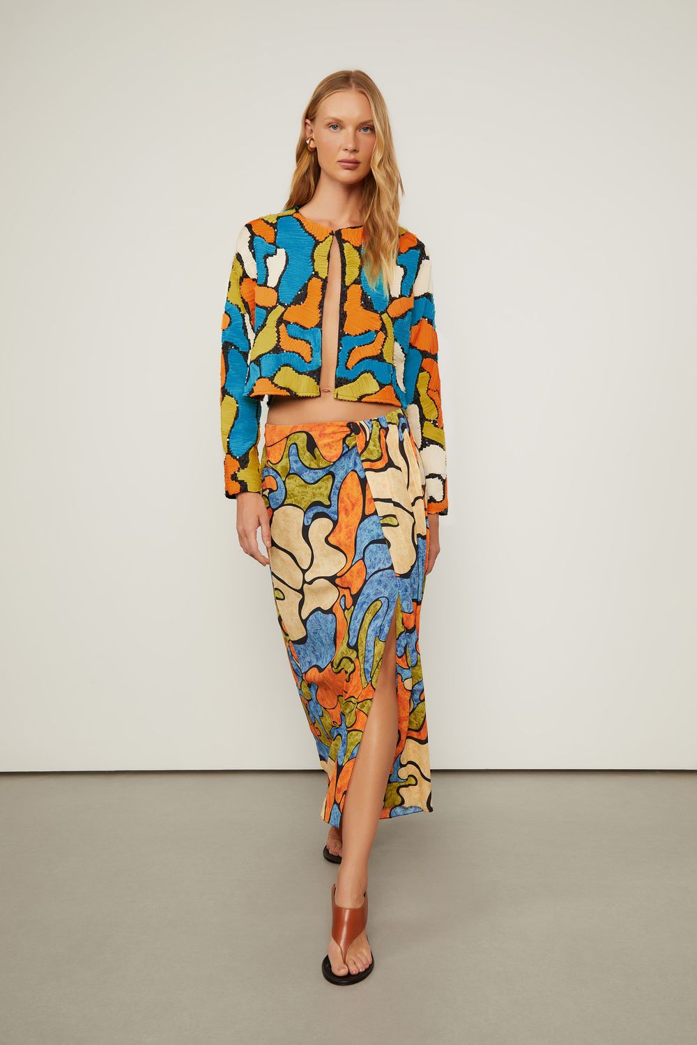 Em uma paleta vibrante, a estampa Floral Líquido traz formas florais em um efeito fluido e dinâmico. A Saia Midi possui forro, shape reto, drapeado frontal e fenda na barra. Para finalizar a produção, aposte em blusas monocromáticas em tecidos sofisticados ou em um total look com o Casaqueto no mesmo estilo.