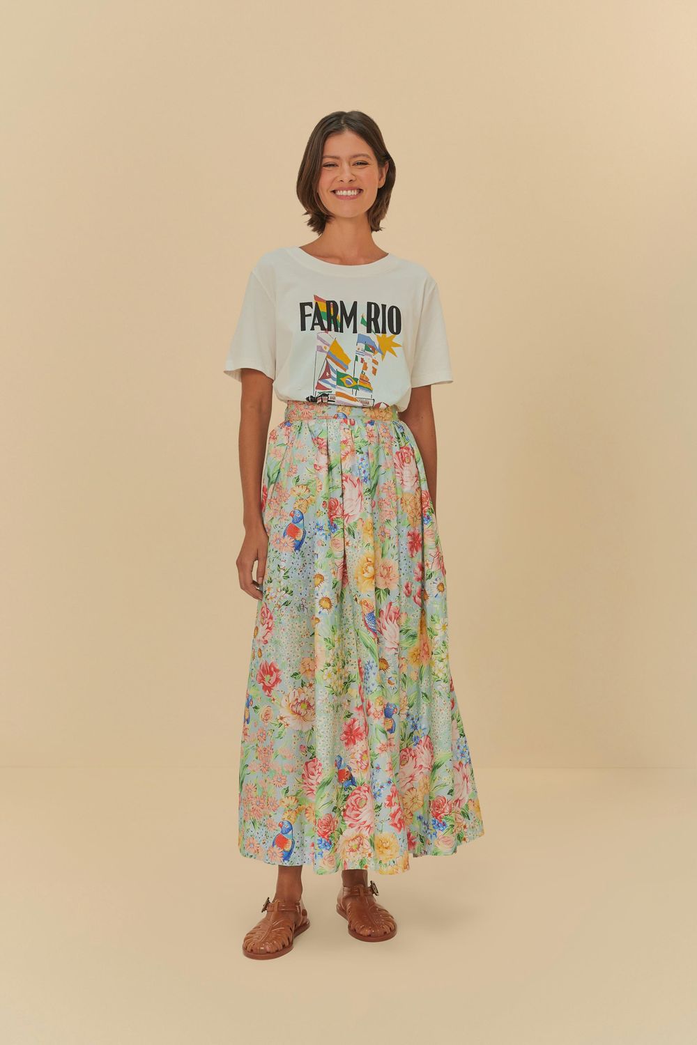 saia estampada canteiro dos passarinhos traz a leveza e o frescor da natureza para o seu guarda-roupa. com cintura alta e modelagem fluida, ela oferece um movimento encantador a cada passo. o fechamento com zíper lateral traz facilidade e conforto. perfeita para um passeio ao ar livre ou um encontro casual. FARM RIO original - inverno 25.-