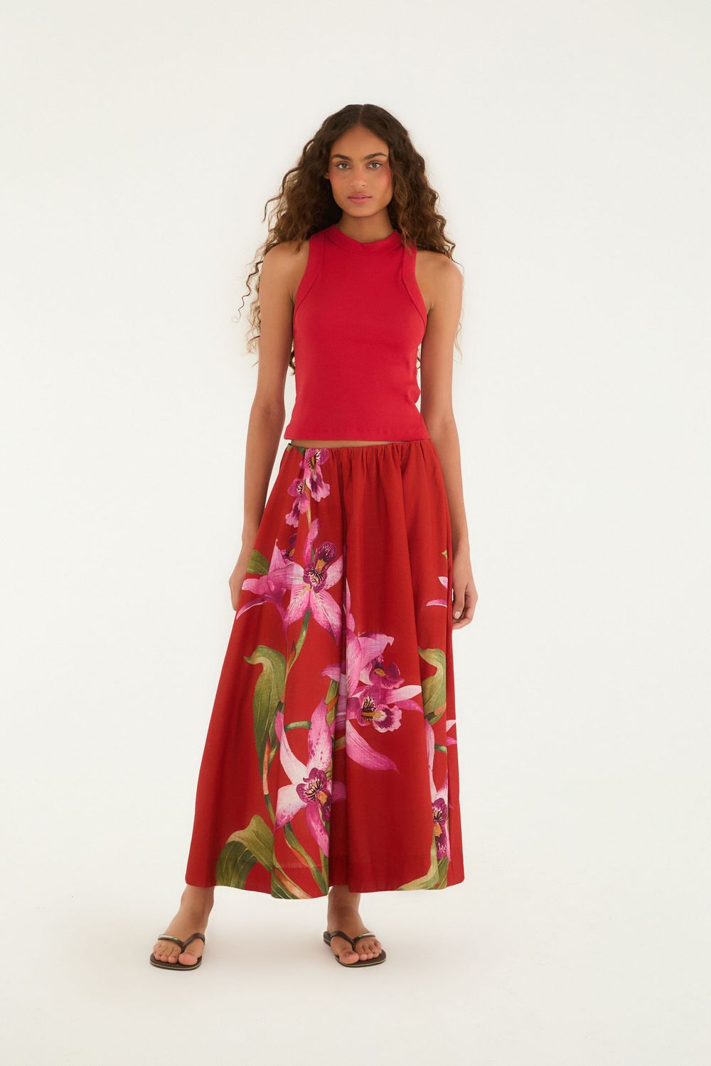 saia estampada floral orquídea. modelo longo e fluido, perfeito para um visual marcante. possui cintura alta com elástico e uma faixa ajustável que valoriza o caimento. a estampa eleva o charme da peça, ideal para momentos casuais ou eventos especiais ao ar livre. FARM RIO original - alto verão 26.-
