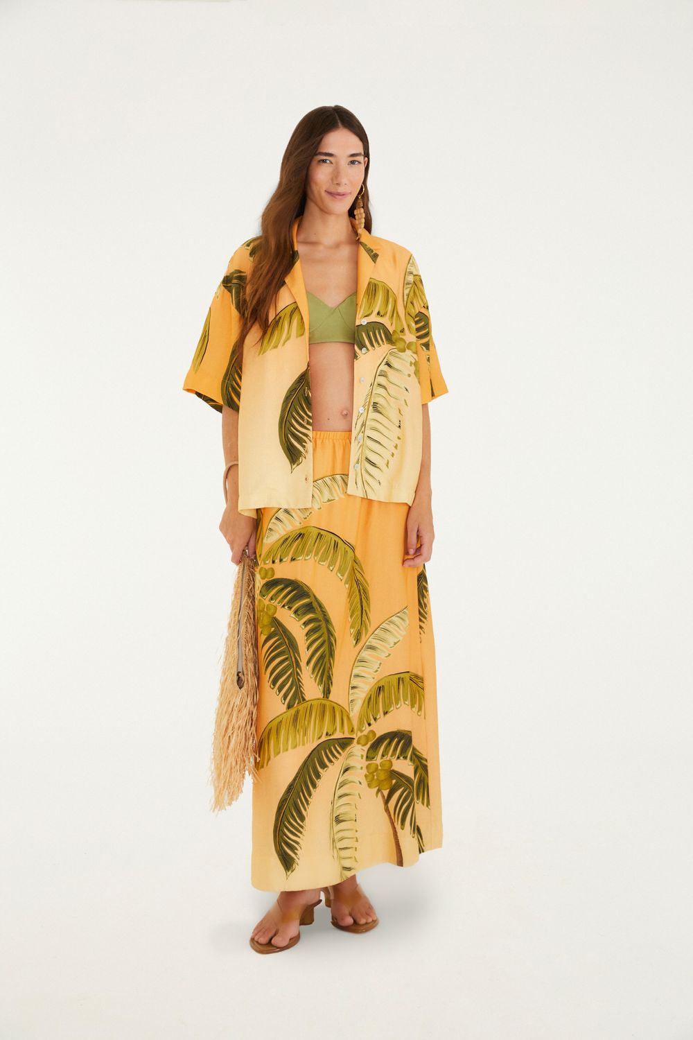 saia estampada itacaré coqueiro laranja. feita em tecido leve, possui caimento fluido que traz liberdade aos movimentos. o comprimento longo e a cintura ajustável com elástico garantem conforto e praticidade. perfeita para festas à beira-mar ou passeios ao ar livre. FARM RIO original - verão 26.-