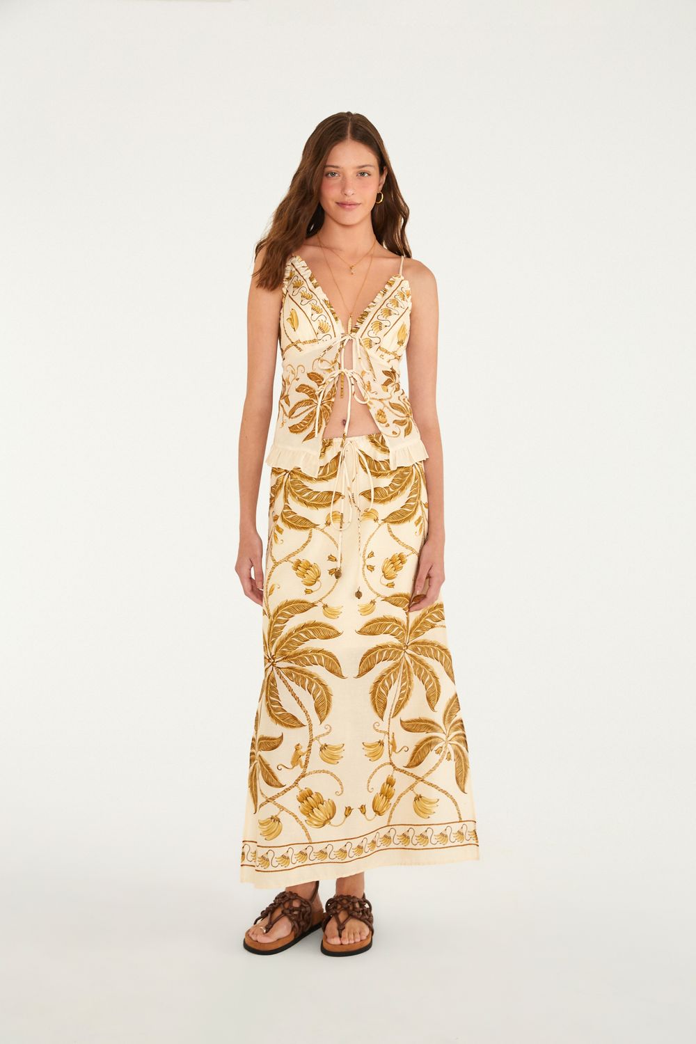 saia estampada ourinho tropical. confeccionada em tecido leve que proporciona liberdade e conforto, com acabamento impecável no cós ajustável por cordinha. a barra apresenta detalhes que realçam o visual, perfeita para um passeio casual ou um encontro especial. peça versátil que mistura estilo e descontração em um único look. FARM Rio, coleção Carioca - inverno 26.-