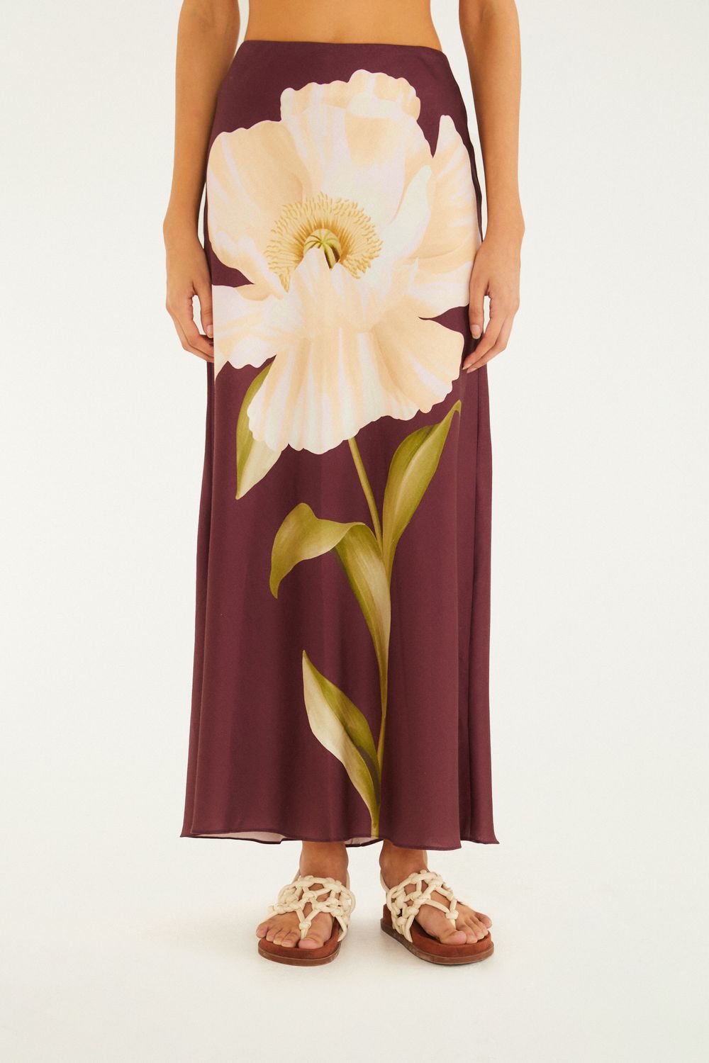 saia papoula. modelo longo e fluido, com cintura alta que valoriza o caimento solto e leve. acabamento em barra discreta e fechamento posterior delicado. esta peça transforma momentos casuais em ocasiões especiais, ideal para dias frescos e noites memoráveis. FARM Rio, coleção Carioca - inverno 26.-