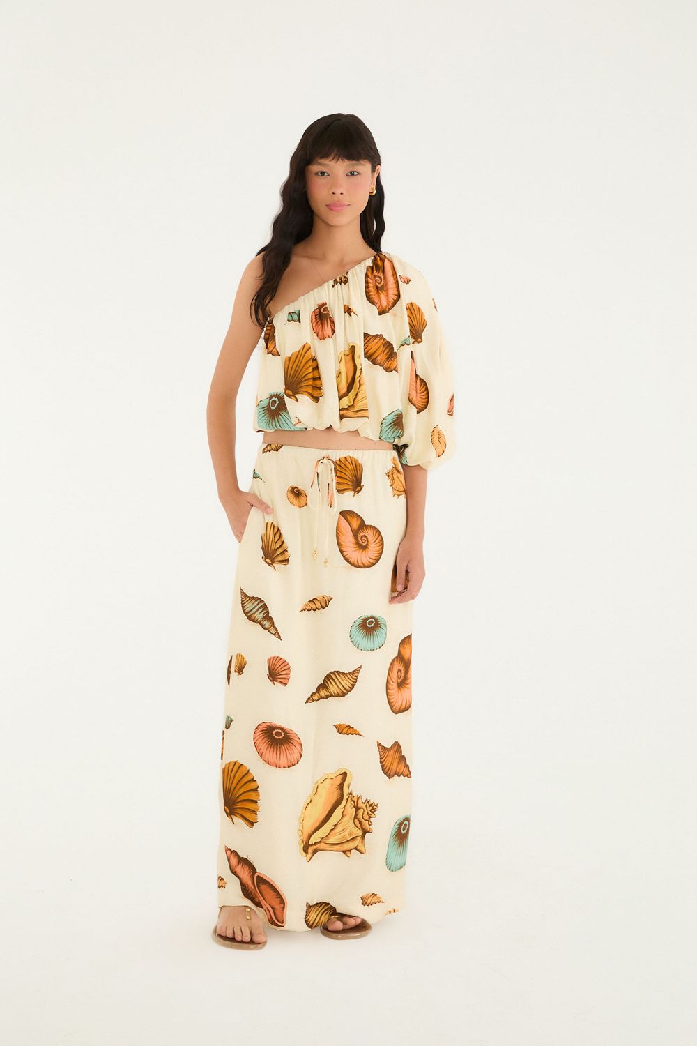 saia estampada souvenir mar. confeccionada em tecido leve, esta saia traz uma modelagem fluida que acompanha o movimento do corpo. com cós alto e fechamento por amarração, proporciona conforto sem abrir mão do estilo. suas cores vibrantes a tornam perfeita para dias ensolarados e eventos casuais ao ar livre. FARM RIO original -alto verão 26.-