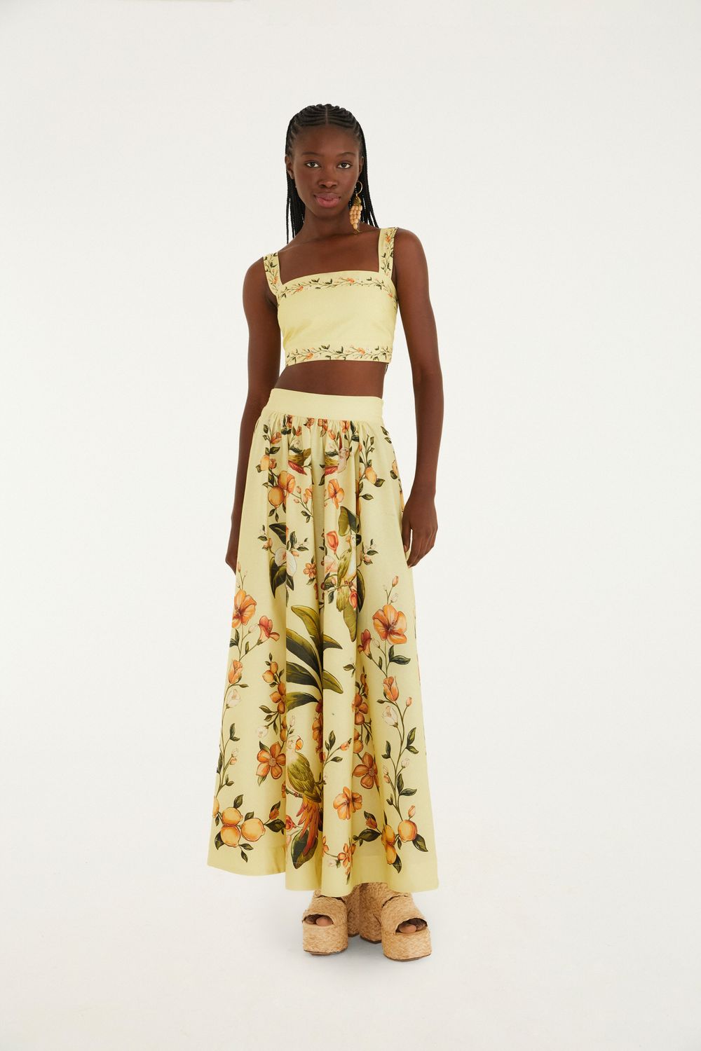 saia evasê estampada bosque chic. confeccionada em tecido leve e fluido, possui cintura alta, fechamento discreto e corte evasê que proporciona movimento à peça. ideal para ocasiões casuais ou especiais, a saia transmite originalidade e charme, elevando qualquer combinação. FARM RIO original - verão 26.-