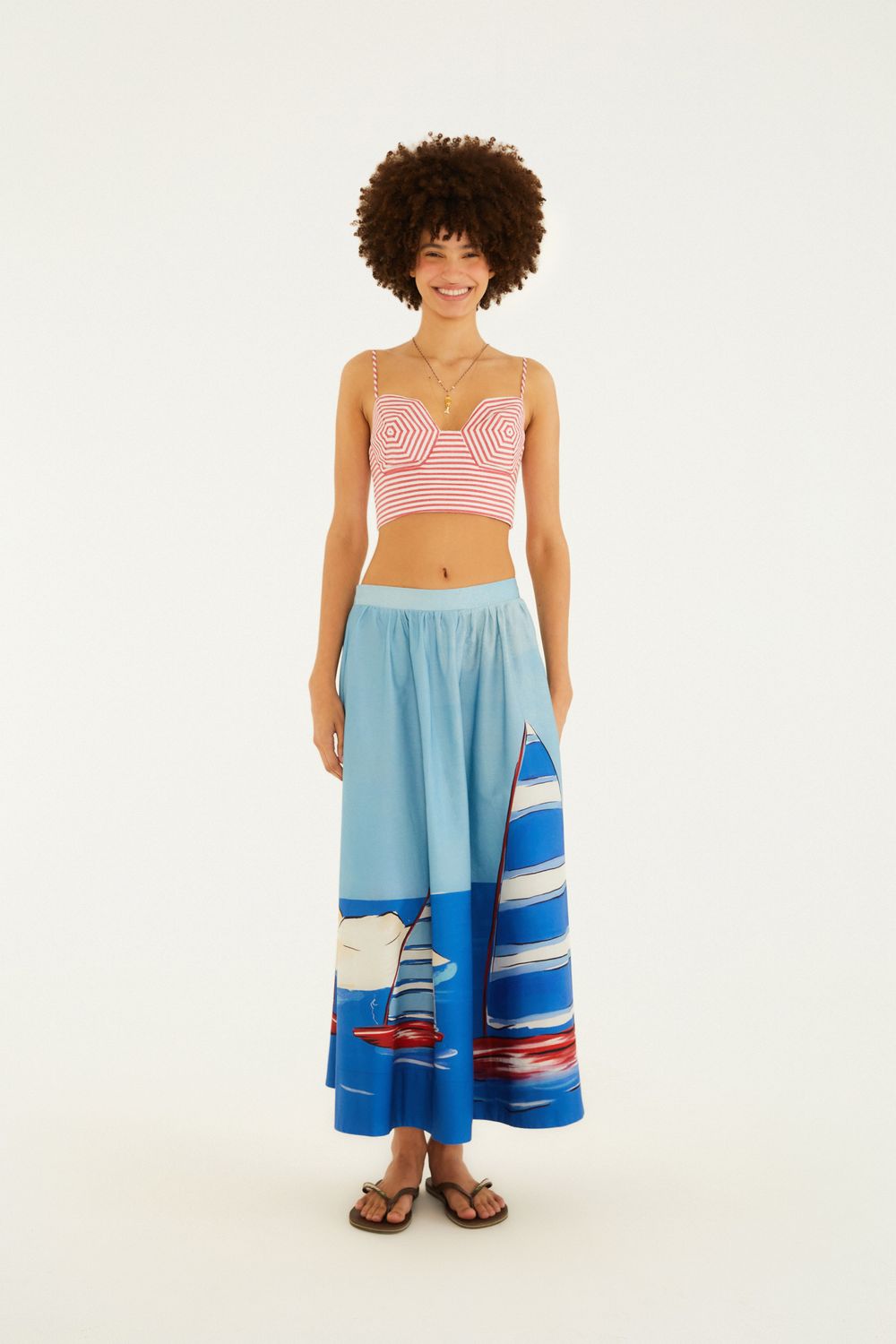 saia evasê estampada diário de verão. modelagem em evasê que proporciona movimento e leveza. cintura com cós ajustável, oferecendo conforto. ideal para momentos casuais ou encontros com amigos. a técnica de estamparia exclusiva destaca a originalidade da peça. perfeita para dias ensolarados e passeios ao ar livre. FARM RIO original - alto verão 26.-