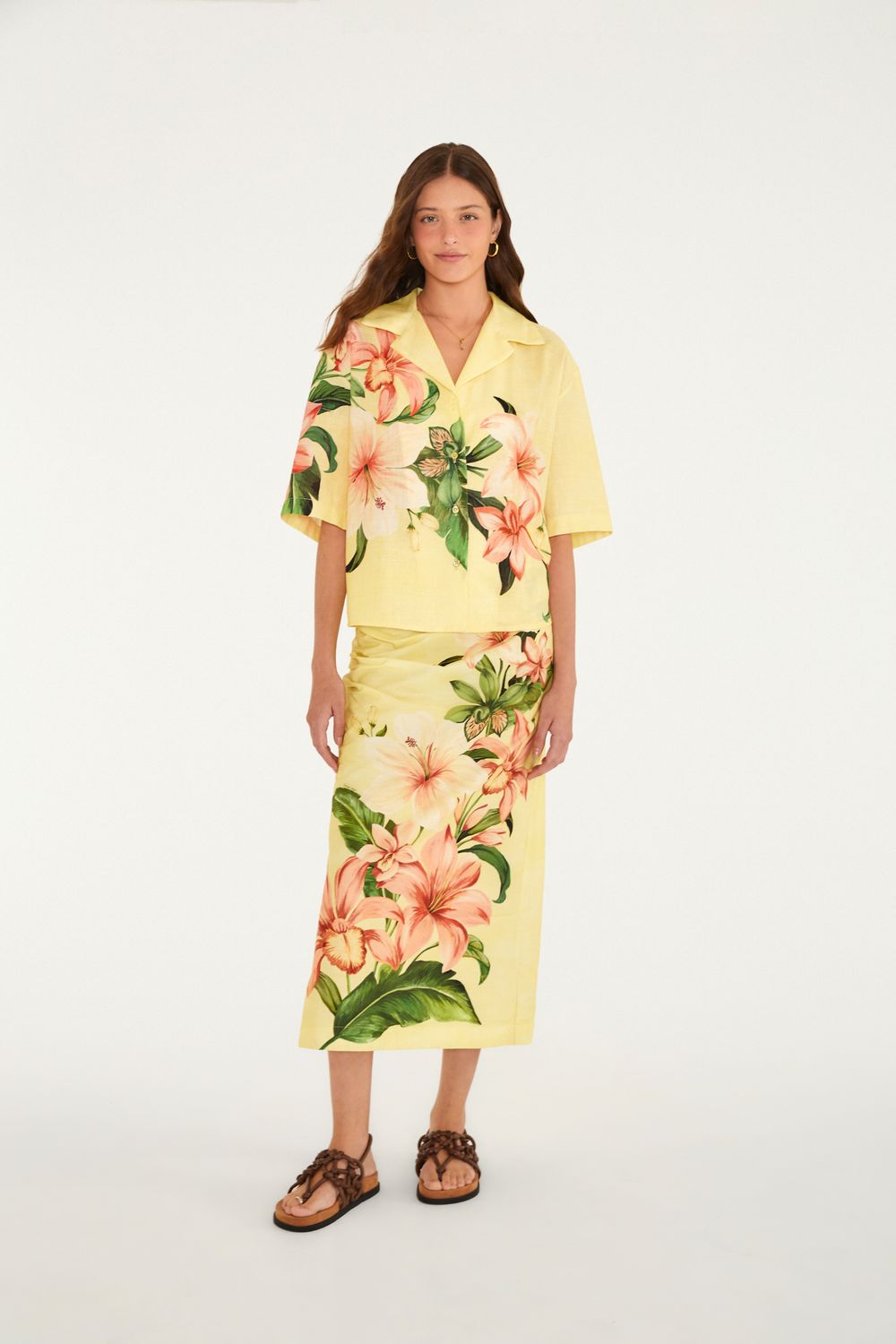 saia floribel. uma peça que captura a leveza e a originalidade da FARM. seu caimento longo e fluido é perfeito para compor um visual casual. detalhes em franzidos laterais conferem movimento e charme extra à peça, que é ideal para passeios ao ar livre ou encontros especiais. FARM Rio, coleção Carioca - inverno 26.-