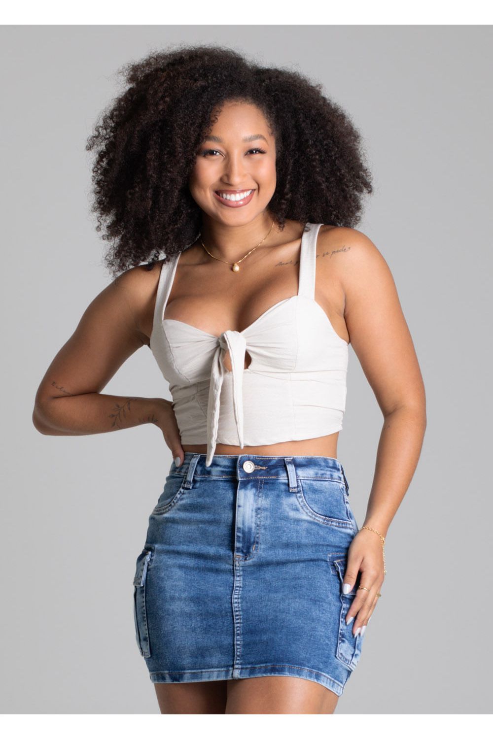 Saia mini feminina confeccionada em jeans O modelo tem comprimento curto e caimento ajustado. A parte frontal tem fechamento com botão e zíper Bolsos frontais e laterais cargo A barra tem acabamento simples Tecido: Jeans Tipo de lavagem: Azul Cor: Azul médio-