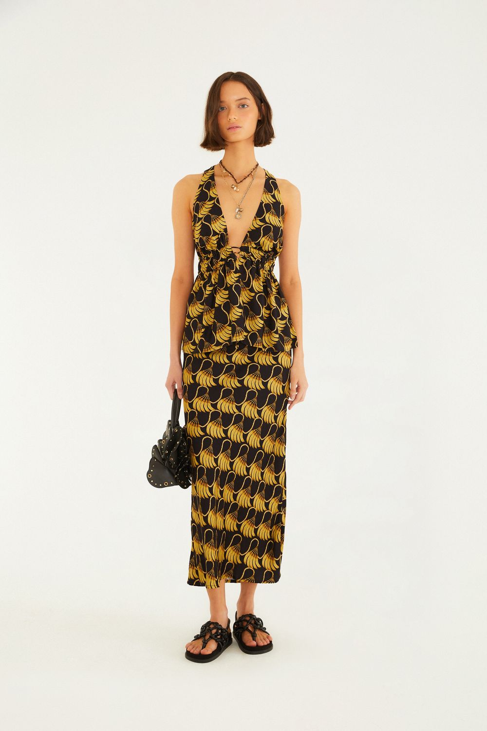 saia longa banana tassel mini traz um estilo único com seu corte alongado e cintura ajustável por cordinha, enriquecido por tasséis que adicionam um charme especial. perfeita para um look casual ou até mesmo para eventos mais especiais. uma peça que conversa com diversos momentos, trazendo conforto e originalidade. FARM Rio, coleção Carioca - inverno 26.-