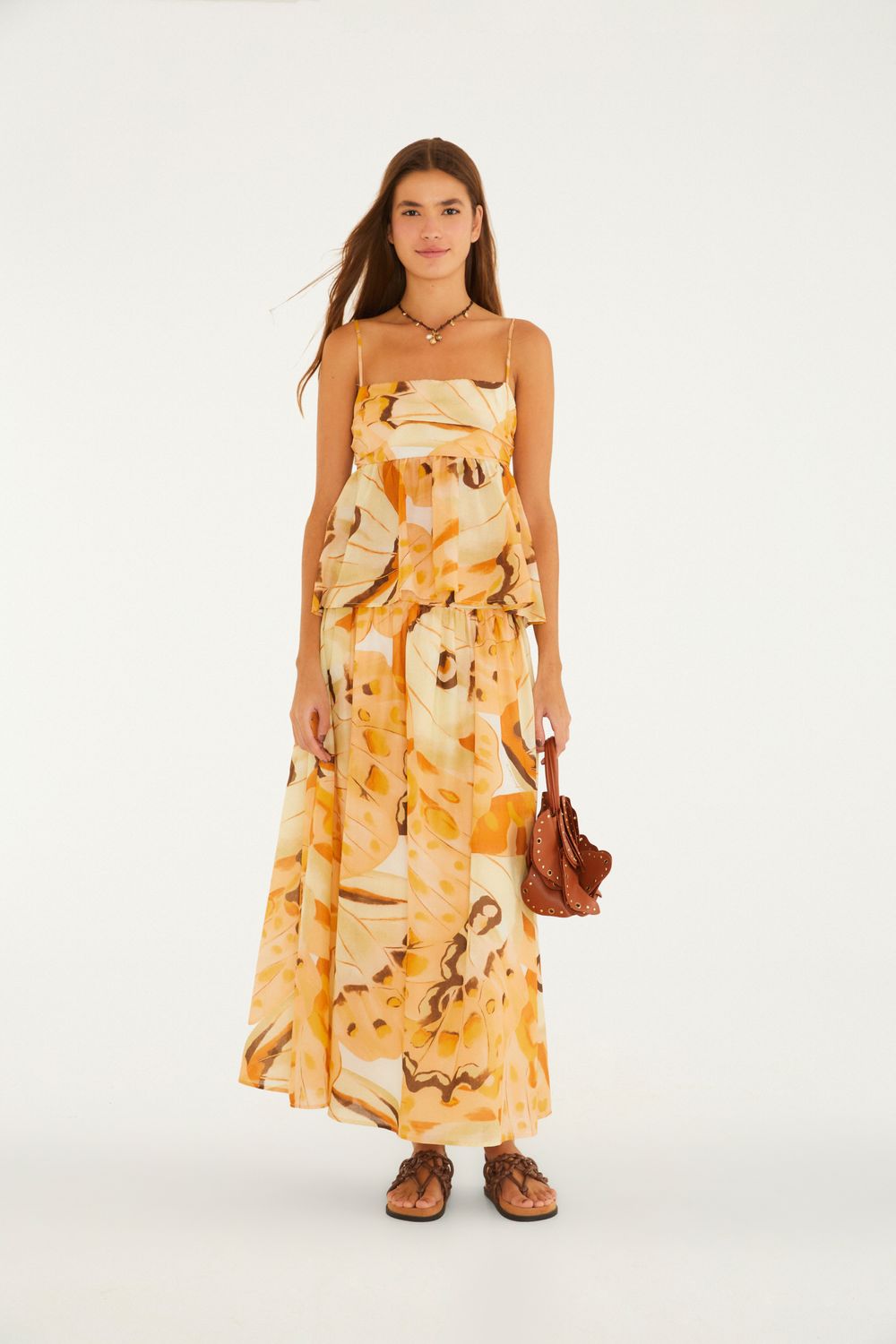 saia longa borbo onca. perfeita para quem busca um visual casual e cheio de personalidade. com alças finas e busto franzido, traz uma combinação única de fluidez na saia longa e caimento leve. ideal para um passeio descontraído ou um evento ao ar livre. aproveite o toque especial que só a FARM oferece. FARM Rio, coleção Carioca - inverno 26.-