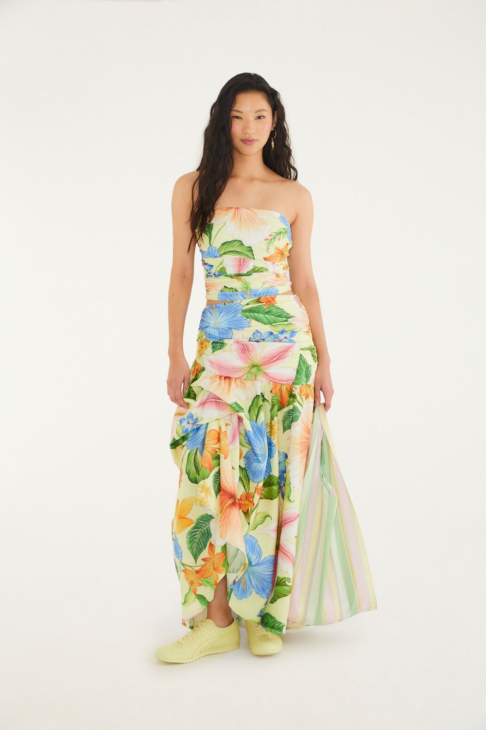 saia longa estampada flor de praia. confeccionada em tecido leve, possui caimento elegante e fluido. o cós é ajustado, garantindo conforto e flexibilidade. as pregas sutis trazem movimento à peça, ideal para um passeio casual ou um evento especial à beira-mar. FARM RIO original - alto verão 26.-