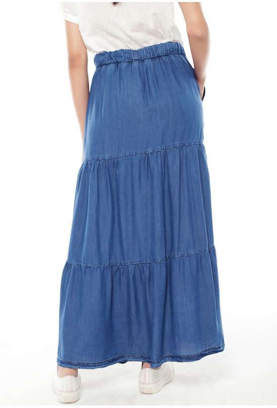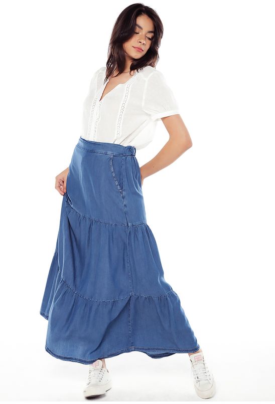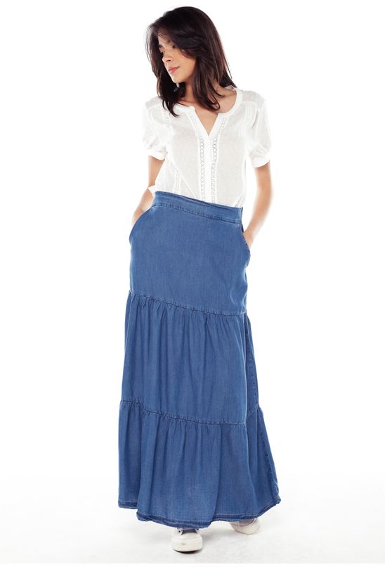 Detalhes: Saia longa jeans com bolsos laterais verdadeiros. Corte rodado 3 marias, com franzido e três camadas. Cintura com cós liso na frente e elástico atrás. Barra fina com duas dobras e pesponto na cor ocre. Sem forro. Tecido muito macio, peso médio, sem transparência. excelente caimento.
