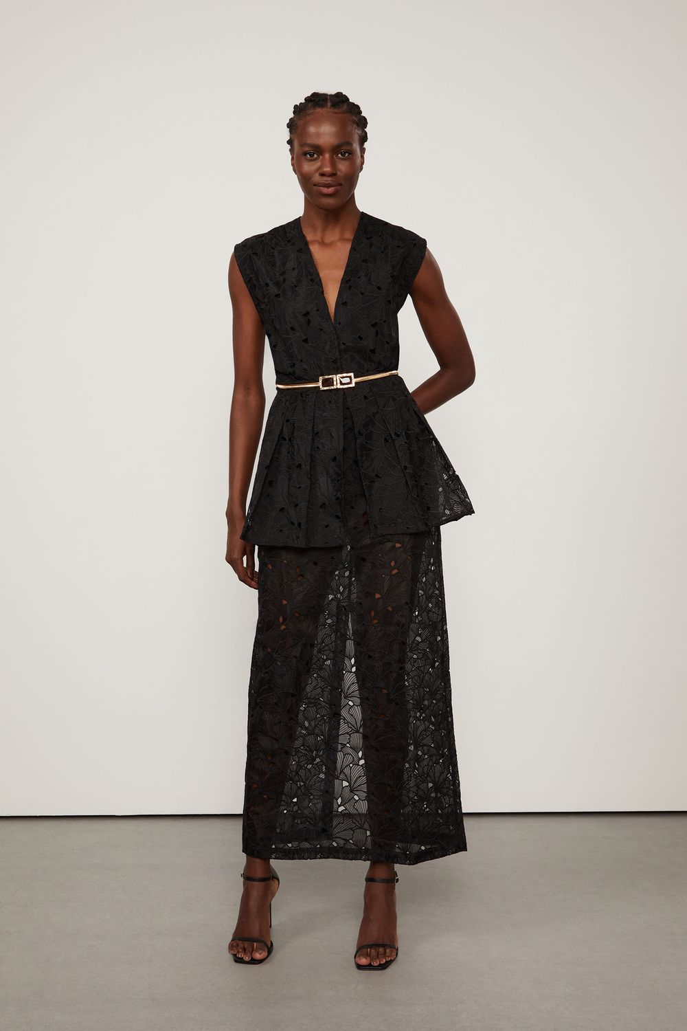 A Saia Longa traz a elegância da coleção unificada ao frescor do verão. Com shape reto e cintura alta, o modelo com basqui ganha destaque especial através dos vazados da renda, deixando a pele à mostra de maneira despretensiosa. Cintos dourados e sandálias altas complementam a produção para a noite, com atitude.