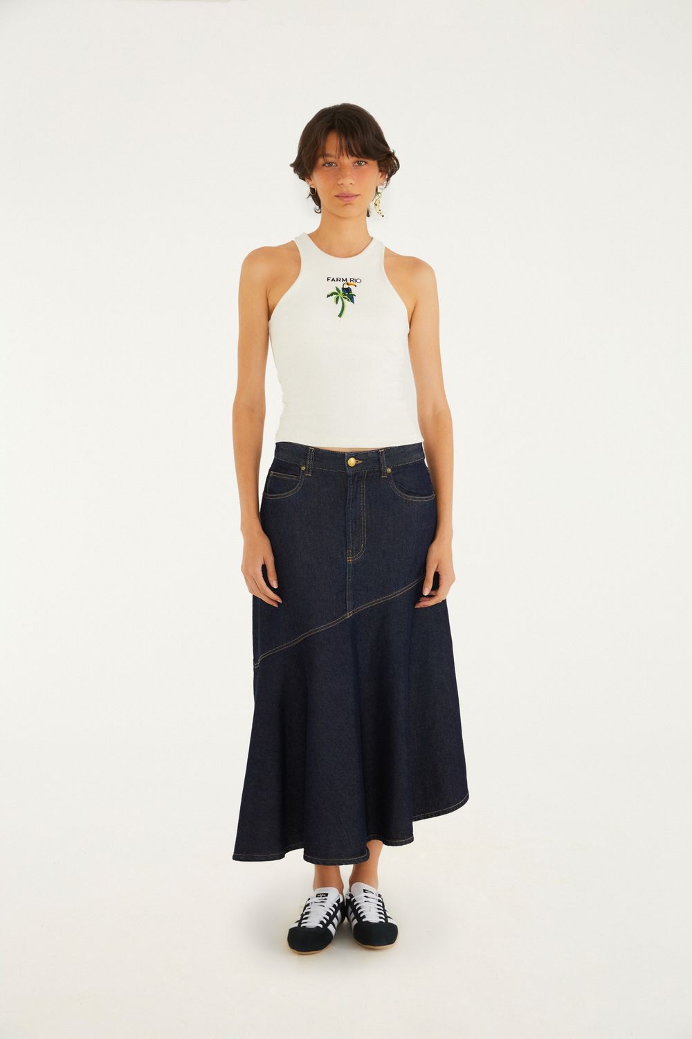 saia midi jeans mullet assimétrica. possui corte diferenciado, destacando-se pelo comprimento irregular que eleva o visual. o design moderno permite uma combinação perfeita entre o casual e o sofisticado, ideal para encontros informais ou ocasiões especiais. confeccionada com atenção aos detalhes e acabamentos que conferem um toque único. FARM RIO original - verão 26.-