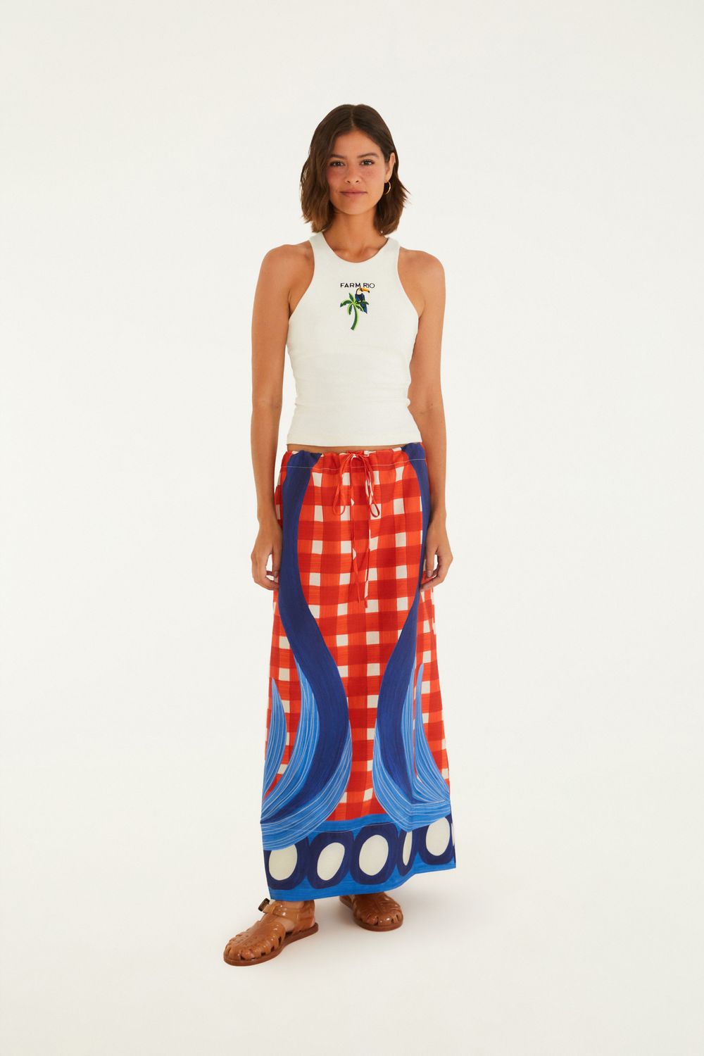 saia midi praia quadriculada. corte evasê que oferece movimento leve e fluido. cintura alta com elástico ajustável, proporcionando conforto. perfeita para um passeio à beira-mar ou um encontro casual na cidade. com um charme único, transforma qualquer momento em uma experiência especial. FARM RIO original - verão 26.-