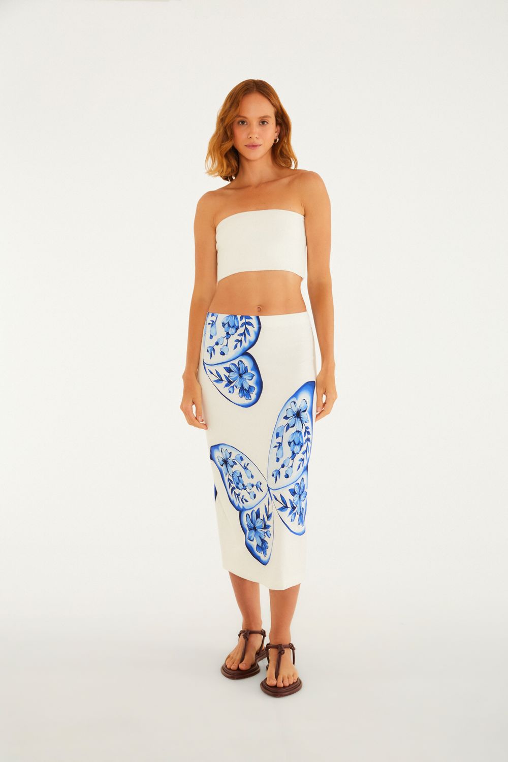 Saia Midi Reta Estampada Borboleta De Porcelana