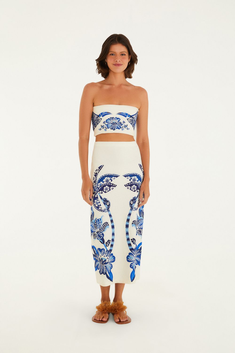 saia midi reta estampada coqueiro tropical. a modelagem reta traz um toque contemporâneo e versátil, perfeita para combinações casuais e elegantes. confeccionada em tecido leve, com fecho discreto na lateral, é a escolha ideal para aquele passeio à beira-mar ou um encontro descontraído. FARM RIO original - verão 26.-