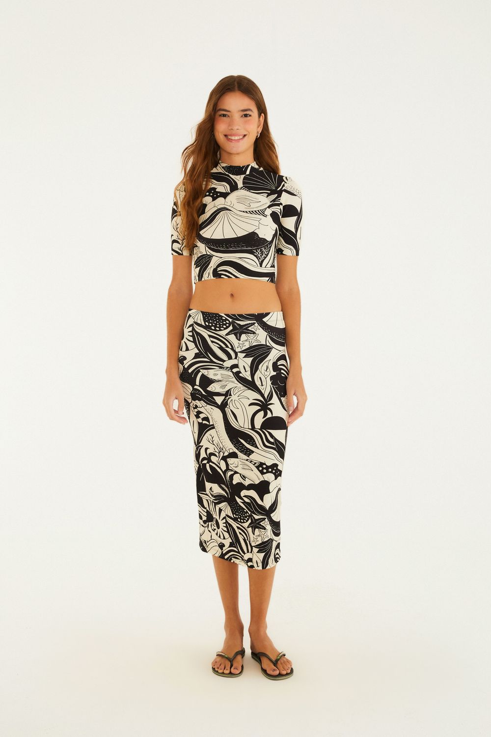saia midi reta estampada festa de mar. possui modelagem reta e cintura média que oferece um caimento casual e versátil. confeccionada em tecido leve, é ideal para ocasiões que vão do escritório ao happy hour. os detalhes da estampa adicionam um toque de originalidade e frescor. FARM RIO original - verão 26.-