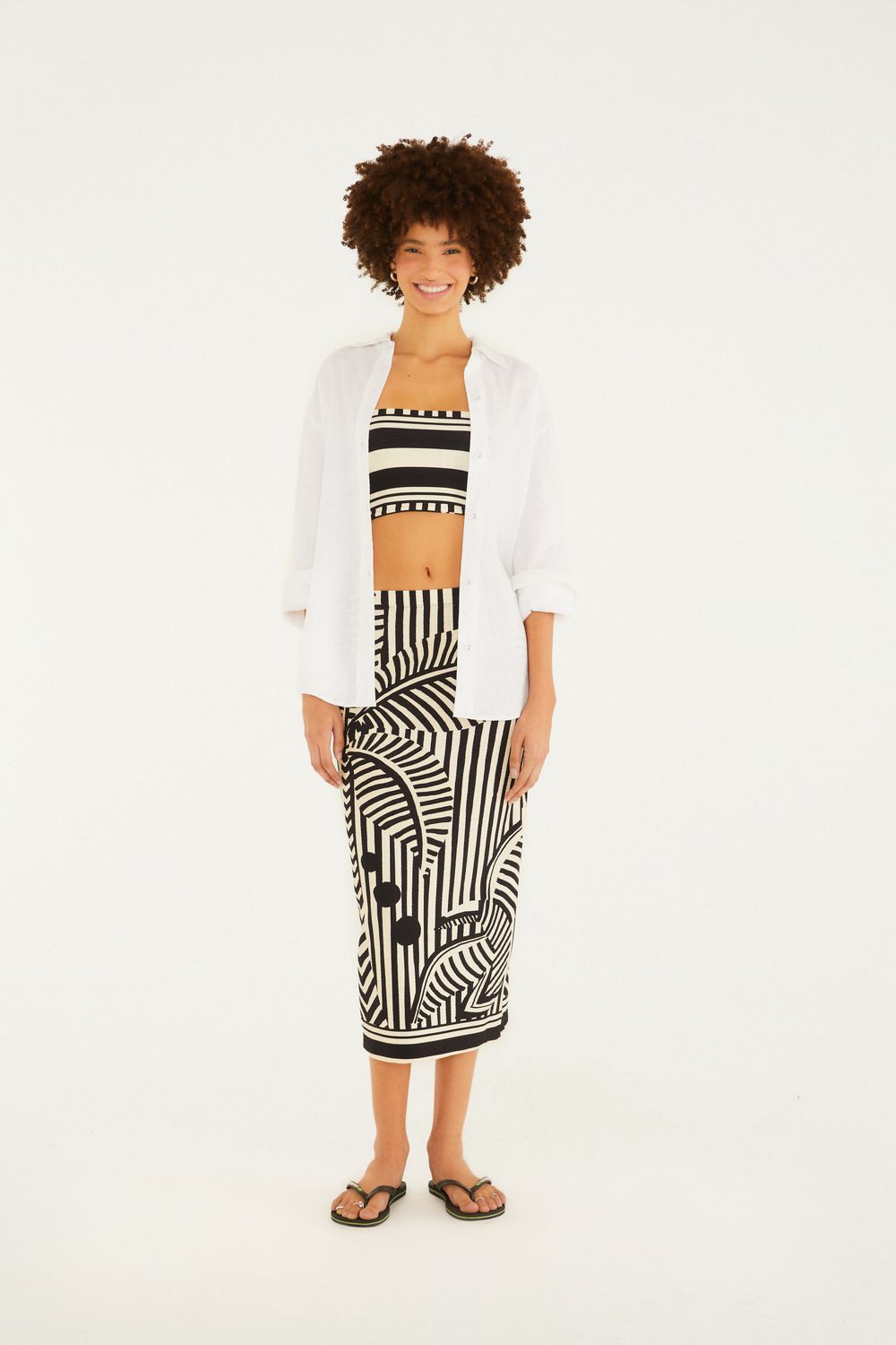 saia midi reta listra tropical. com design atemporal e corte reto, a peça é ideal para um look versátil. seu comprimento midi permite combinações tanto para o dia a dia quanto para eventos casual chic. confeccionada em tecido leve, oferece conforto e um toque de originalidade. a estampa listrada garante um visual moderno e elegante. FARM Rio, coleção Carioca - inverno 26.-