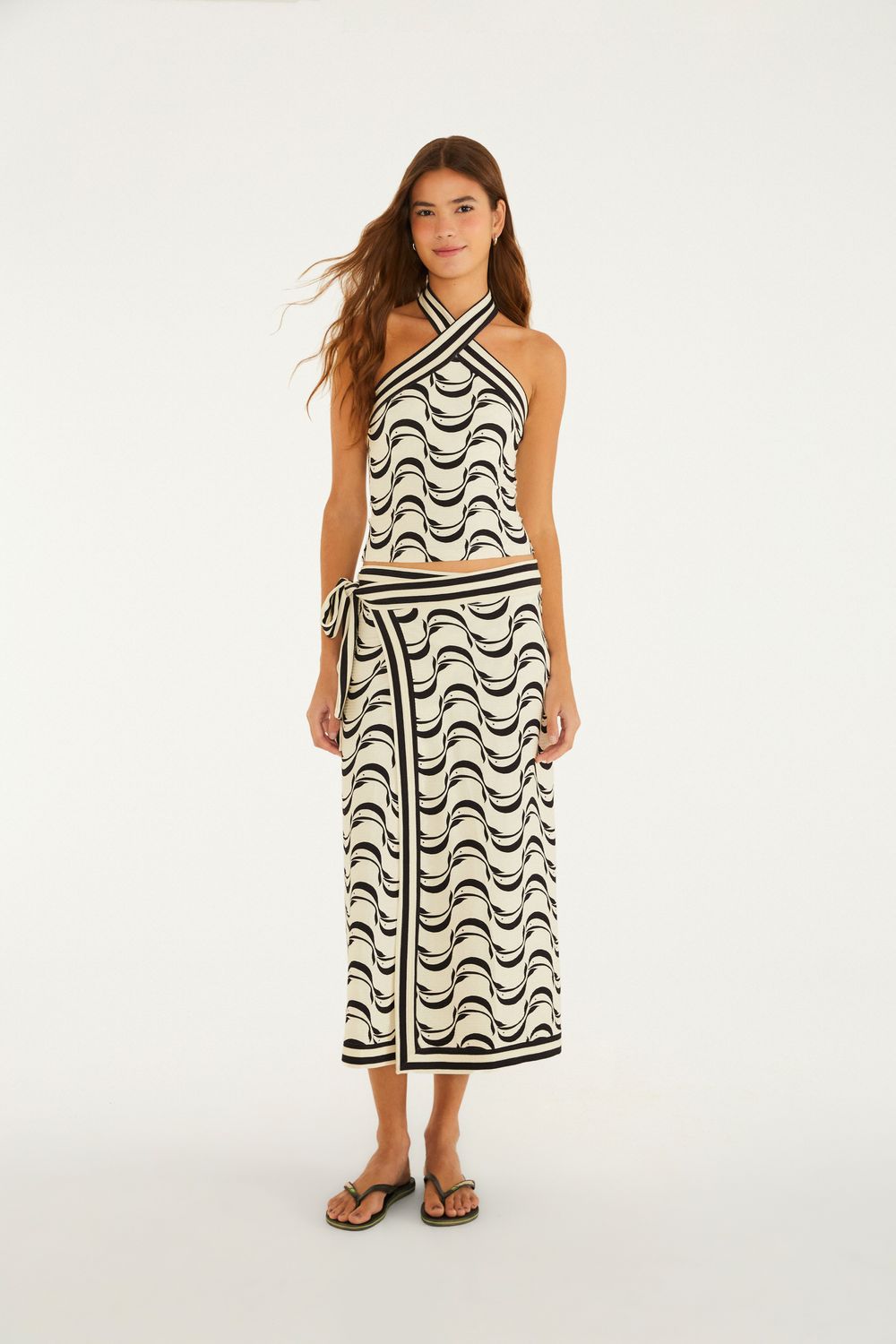 saia midi transpasse estampada peixe copa. modelagem envolvente e caimento leve, perfeita para criar looks que transitam entre o casual e o sofisticado. o transpasse frontal dá um charme extra, enquanto a estampa exclusiva adiciona um toque original ao visual. ideal para ocasiões que pedem conforto e estilo. FARM RIO original - verão 26.-