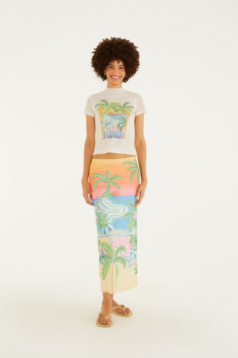 saia midi tule estampada paisagem solar. confeccionada em tule leve com estampa exclusiva, oferece caimento fluido e movimento natural. o cós alto proporciona conforto e versatilidade. perfeita para um passeio ao ar livre ou um encontro casual. FARM RIO original - alto verão 26.-