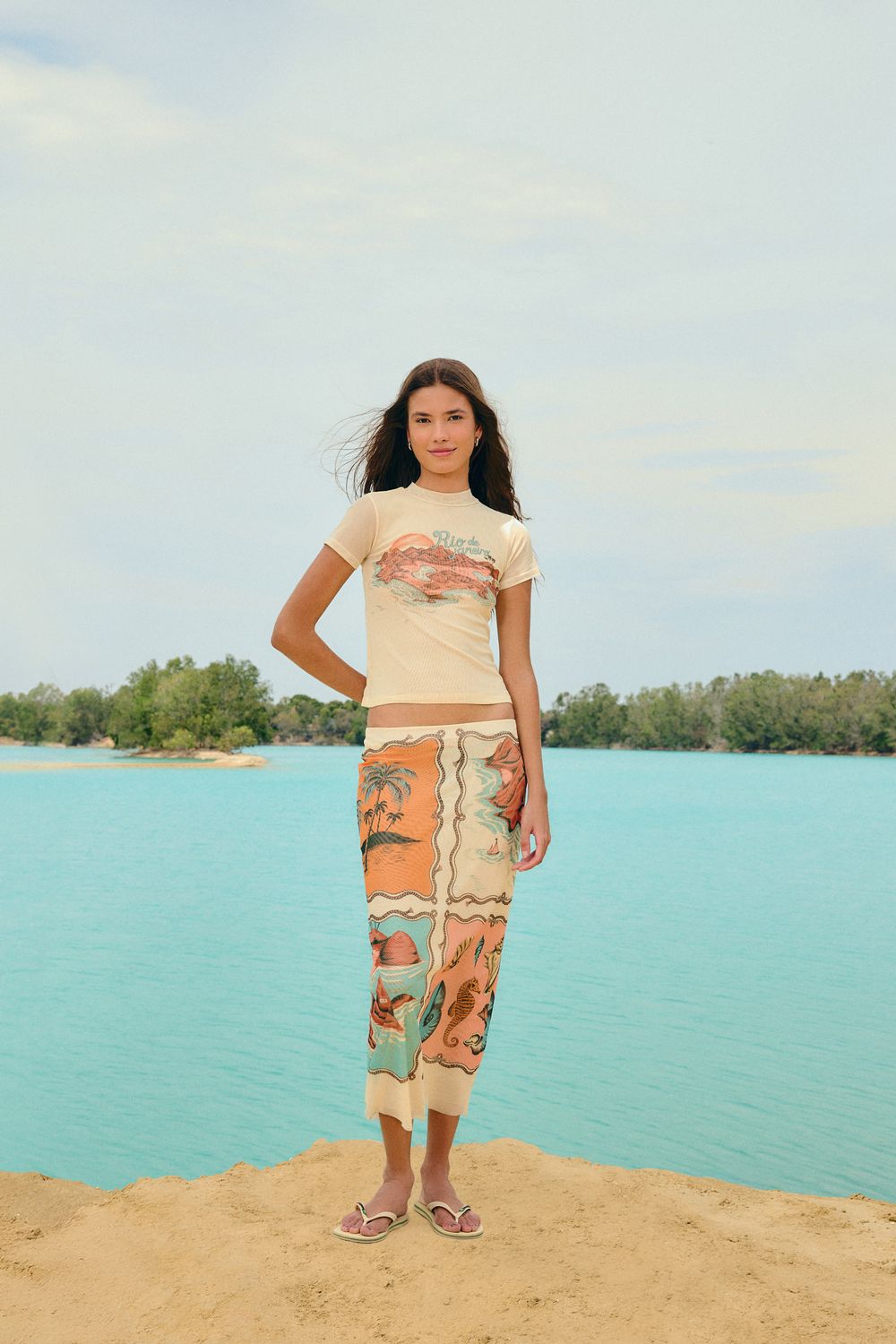saia midi tule estampada souvenir rio. com um toque fluido e cintura alta, essa peça une leveza e originalidade em cada detalhe. ideal para um passeio à beira-mar ou um almoço casual, sua transparência sutil traz uma personalidade única. um presente visual para qualquer ocasião. FARM RIO original - alto verão 26.-