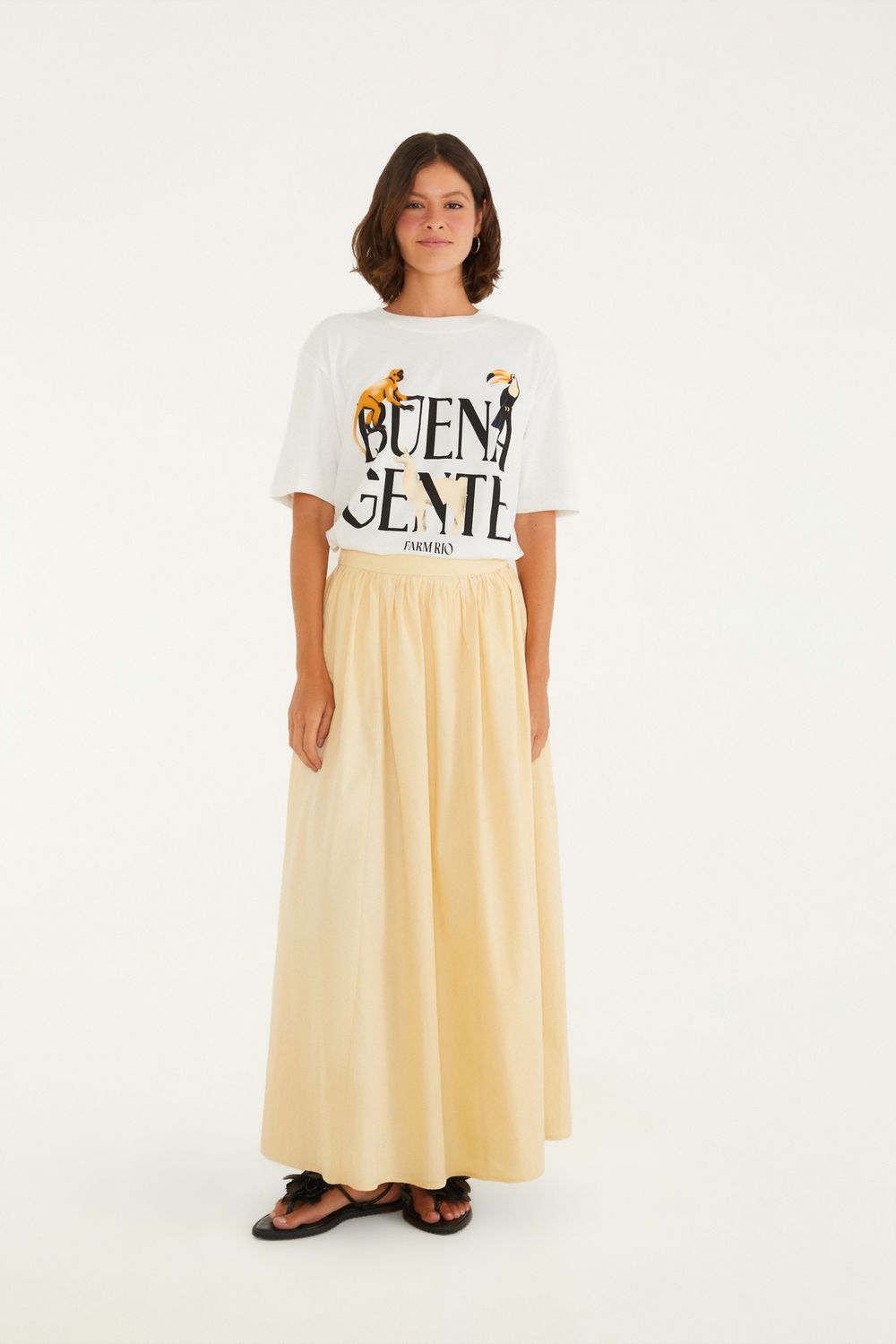 saia pregas frente. com design único, possui pregas elegantes na parte frontal que conferem movimento e leveza ao caminhar. o cós ajustável garante conforto, enquanto o comprimento longo eleva a peça a um nível de praticidade ideal para um passeio casual ou um jantar especial. uma peça essencial para compor o seu guarda-roupa com charme e originalidade. FARM RIO original - verão 26.