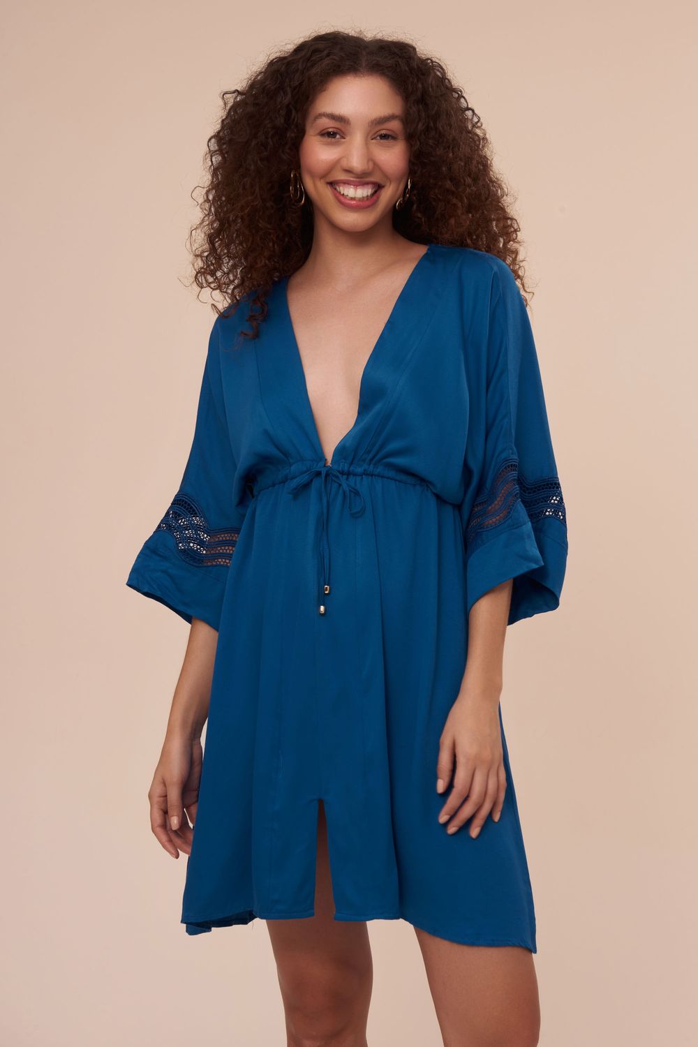 • 100% viscose • detalhe de aplicação de guipuire • a modelo veste P best seller na coleção ola. versátil, pode ser usada como vestido ou saída de praia. modelagem solta com mangas ¾ com recortes e aplicação de guipuire em ondas. decote v e amarração na cintura permitindo um perfeito ajuste ao corpo. tecido 100% viscose. simplesmente linda!-