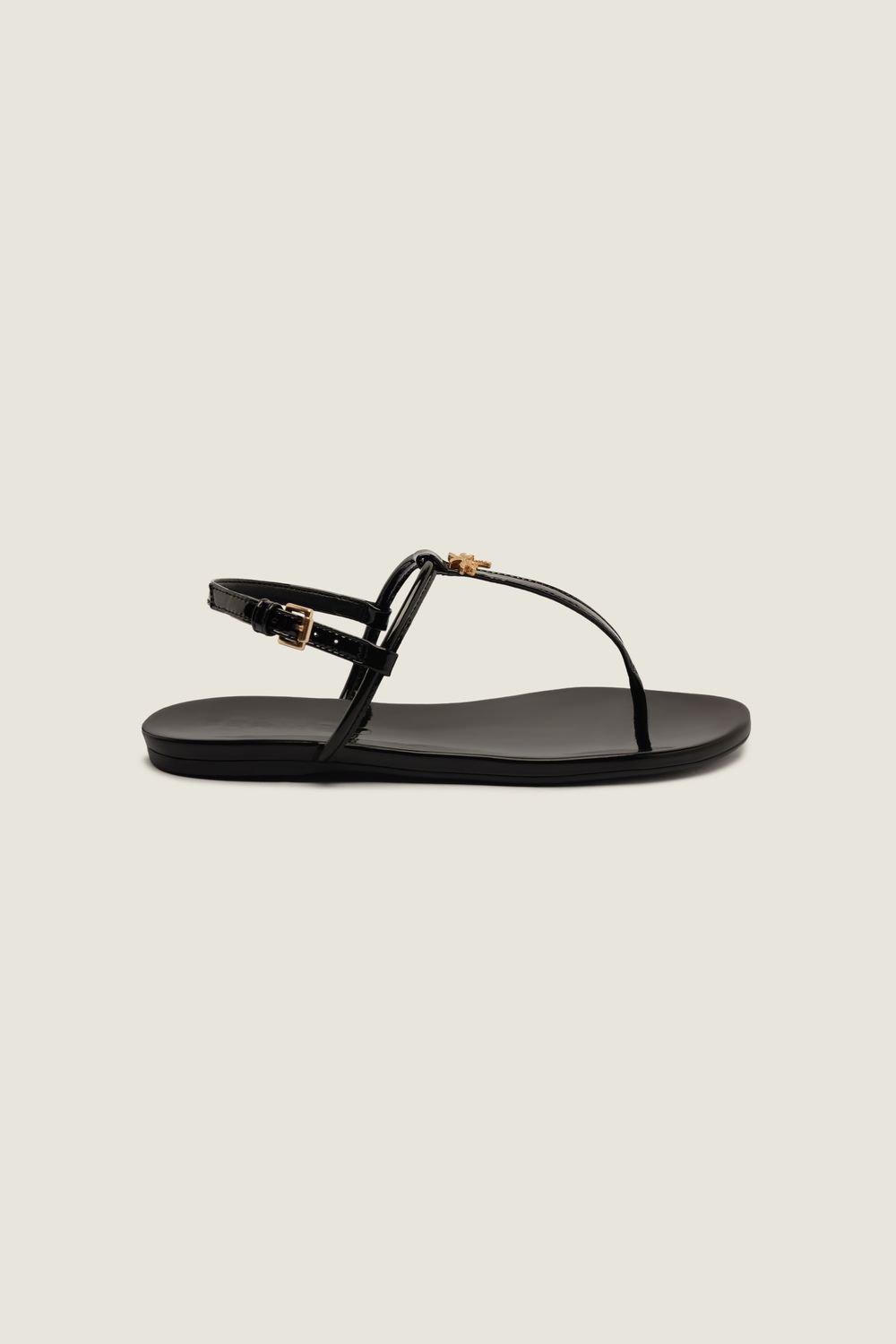 sandália rasteira slim com pin. é aberta, com uma tira entre os dedos que sobe até o peito do pé, ligando a outra tira fina, que estabiliza a tira do cabedal. possui um ornamento dourado em formato de coqueiro, combinando com a fivela também dourada. o modelo possui palmilha confortável e a assinatura FARM Rio.-