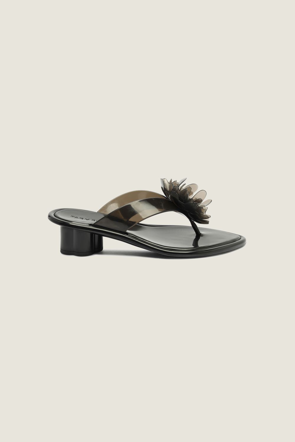 sandália de dedo de salto inteira em PVC, com pontos de translucidez. o bico folha traz um design diferenciado e sofisticado. a tira V é mais larga, proporcionando conforto e segurança, enquanto o detalhe único do desenho da folha de monstera na sola adiciona um toque tropical e moderno aliado ao enfeite de hibisco na tira. além disso, o detalhe do salto em formato de flor garante charme em cada passo. esta é uma peça exclusiva da linha Apé, a nova linha de calçados FARM Rio.-
