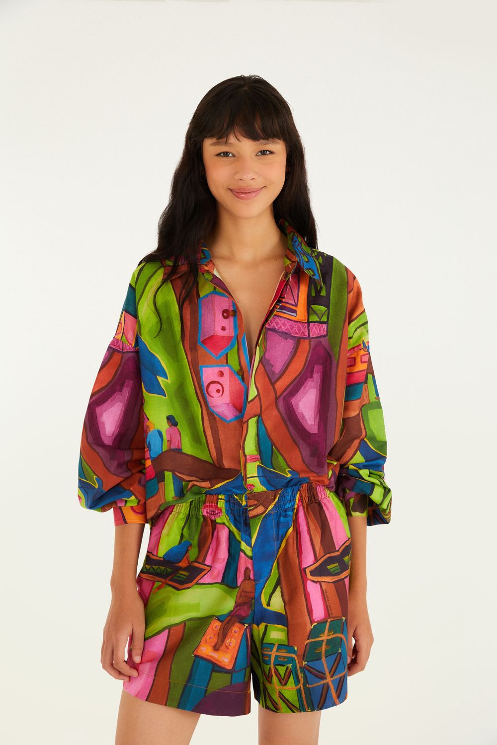 short estampado tropical sound system. com uma modelagem leve e confortável, este short possui cós elástico que adapta-se ao corpo, permitindo liberdade de movimento. ideal para momentos casuais e descontraídos, combinando perfeitamente com dias ensolarados e passeios ao ar livre. FARM RIO original - verão 26. este produto é um lançamento da coleção Amazônikas, que nasce do encontro entre o universo criativo da FARM Rio e a força artística do Norte do Brasil. quatro artistas visuais de diferentes regiões da Amazônia — Bonikta, P.V. Dias, Wira Tini e Astro Amazônico — expressam diferentes perspectivas em uma série de estampas desenvolvidas a partir de suas histórias e manifestações culturais. a estampa tropical sound system, co-criada com PV Dias, retrata as mediações neomusicais e tecnológicas que constroem a musicalidade principalmente do Pará. os pássaros atravessam de um canto a outro, dos soundsystems colombianos, maranhenses, paraenses, jamaicanos e constroem uma Amazônia tecnológica, extremamente sofisticada e super contemporânea.-