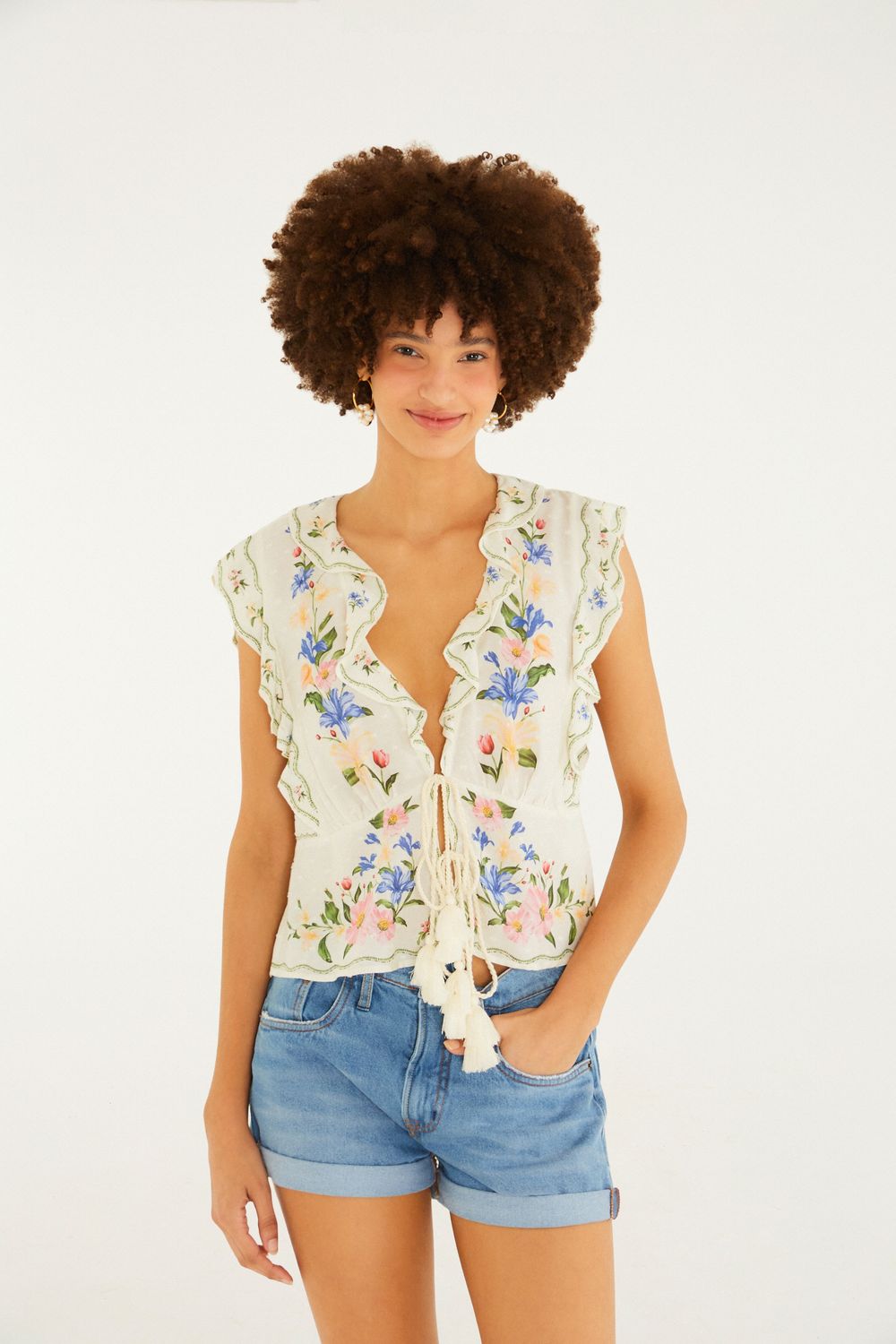 short jeans basico bainha virada. a peça traz um design clássico com cintura média e bainha dobrada, ideal para looks casuais e descontraídos. apresenta bolsos frontais e traseiros funcionais e fechamento com botão e zíper. perfeito para dias ensolarados, combinando com blusas leves e sandálias. FARM Rio, coleção Carioca - inverno 26.-