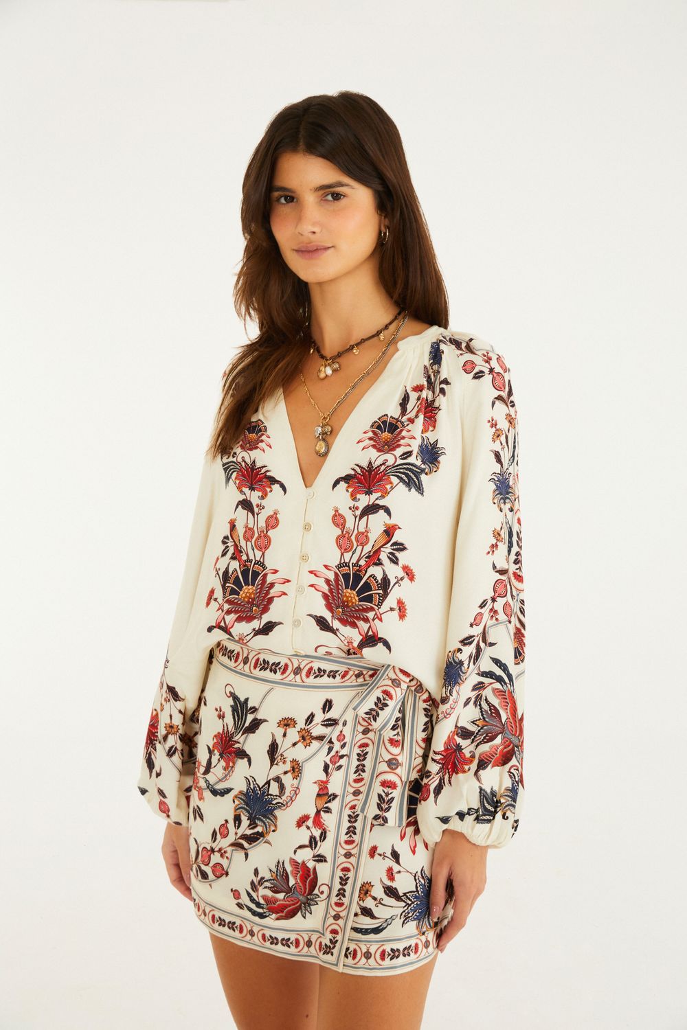 short saia bohoflor. com cintura alta e fecho lateral, ele traz a praticidade do short aliada à elegância da saia. seu tecido leve proporciona conforto em dias casuais, enquanto a estampa floral garante frescor e originalidade. perfeito para um passeio diurno ou um encontro descontraído. FARM Rio, coleção Carioca - inverno 26.-