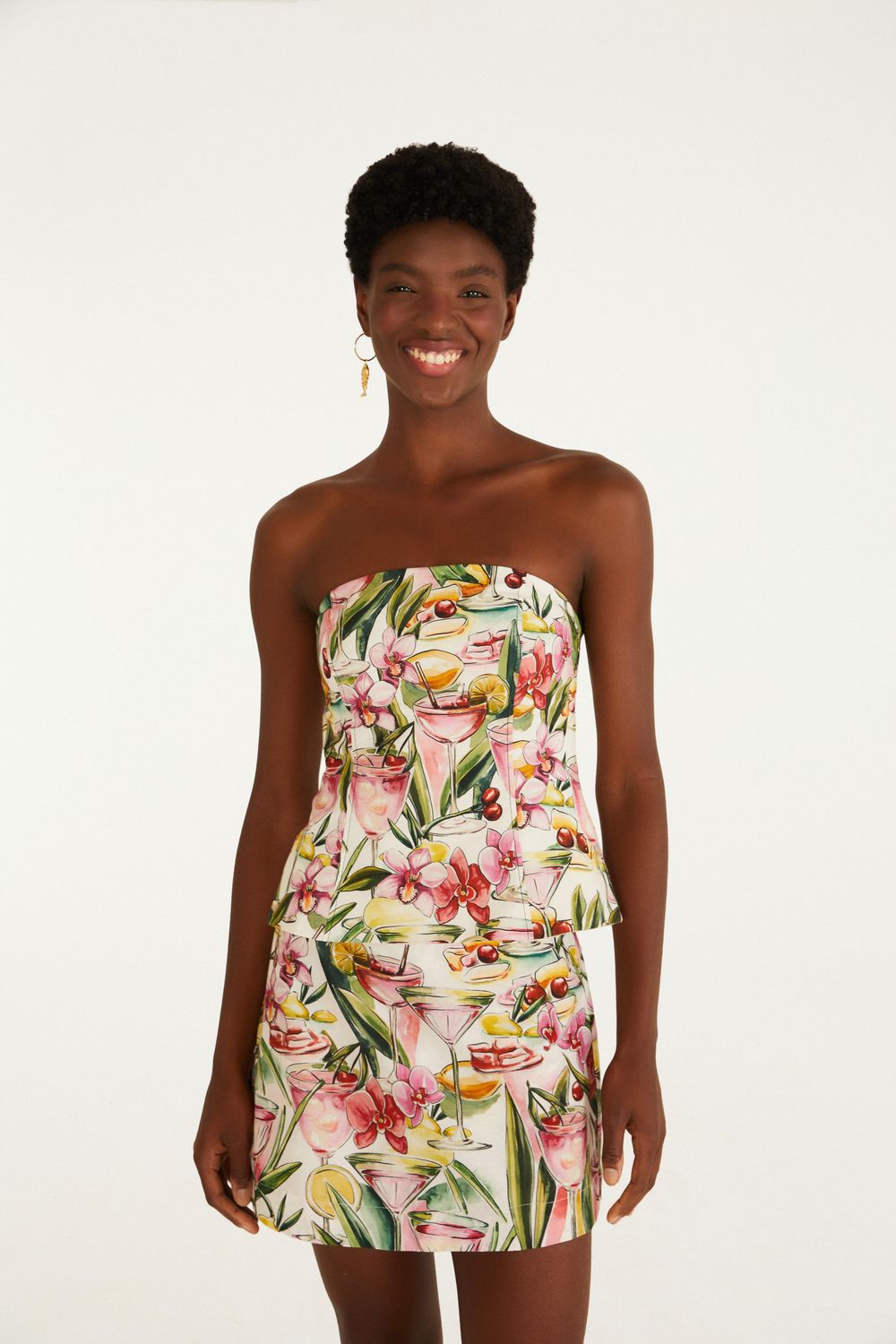 short saia estampado drink. com modelagem prática e design envolvente, a peça une o conforto de um shorts e a fluidez de uma saia. o cós estruturado e a bainha arredondada garantem um toque moderno e singular. perfeito tanto para um passeio no parque quanto para um encontro casual. FARM RIO original - alto verão 26.-