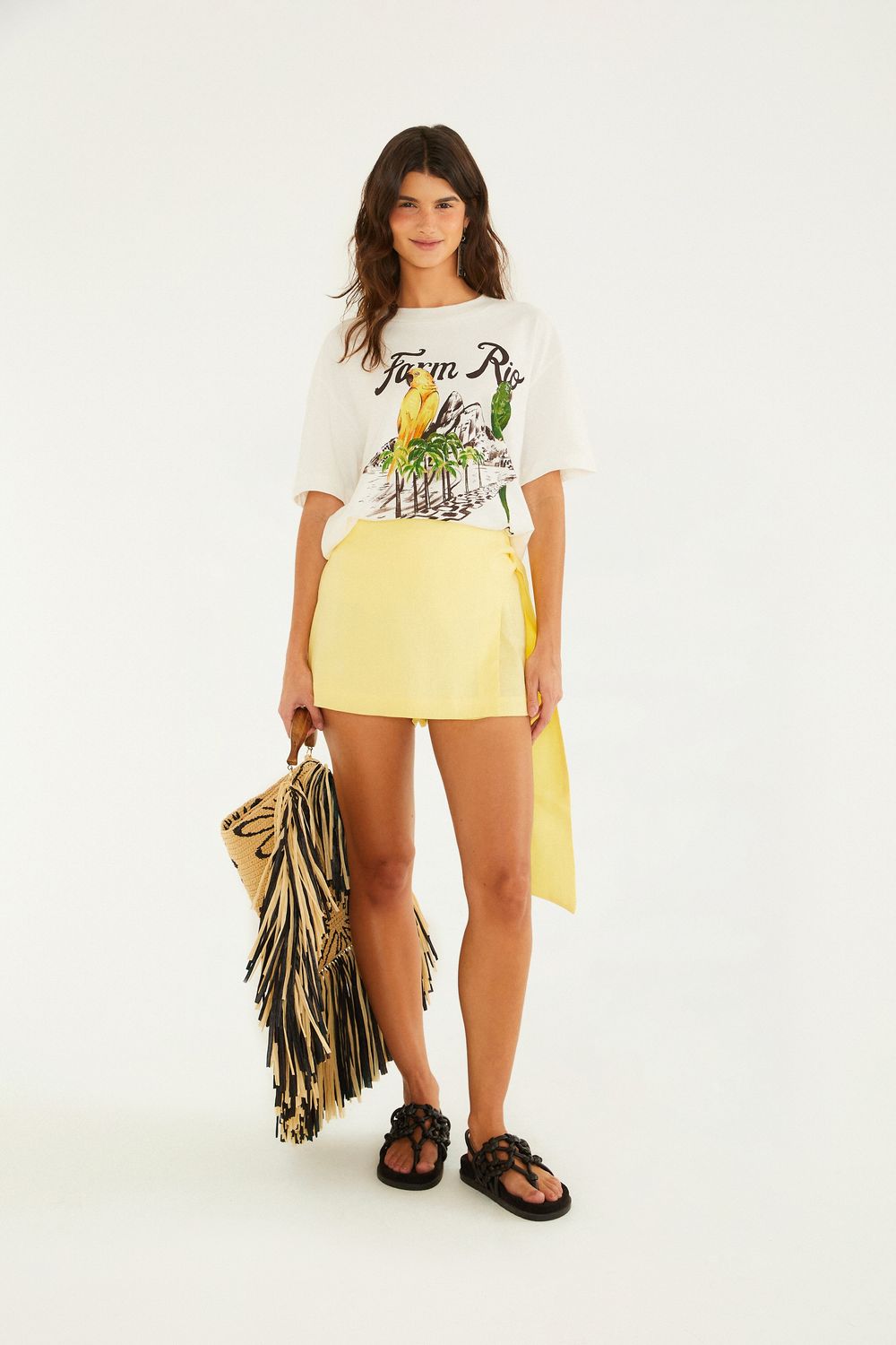 short saia faixa. mistura perfeita entre o visual casual e o toque moderno, com amarração lateral que traz charme e originalidade. a barra levemente arredondada cria um movimento fluido, ideal para um passeio no parque ou um brunch de fim de semana. tecido leve proporciona conforto durante o uso, combinando estilo com praticidade. FARM Rio, coleção Carioca - inverno 26.-