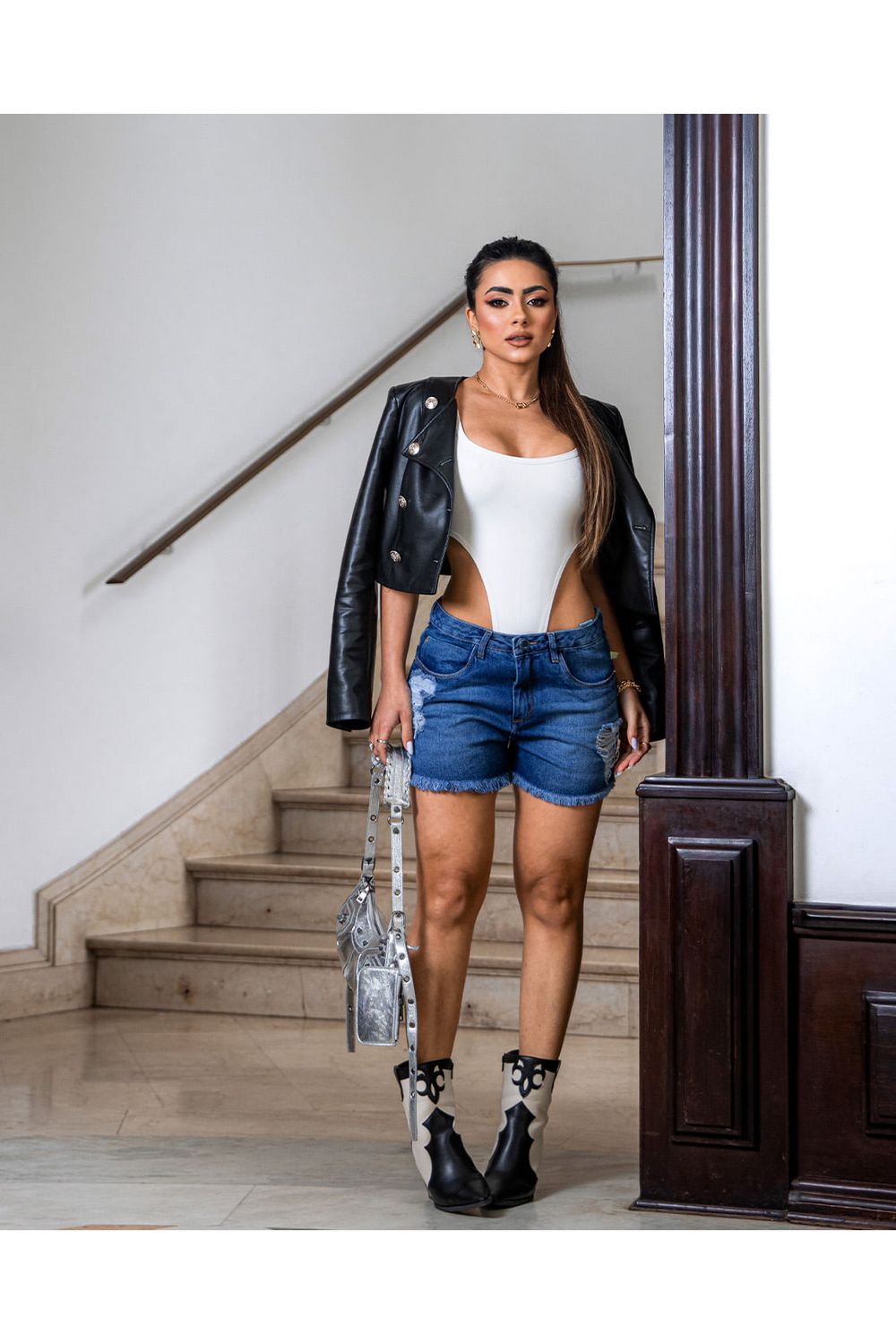 Shorts Jeans Feminino Boyfriend com Abertura Lateral Na Barra Desfiada 00243 Escura