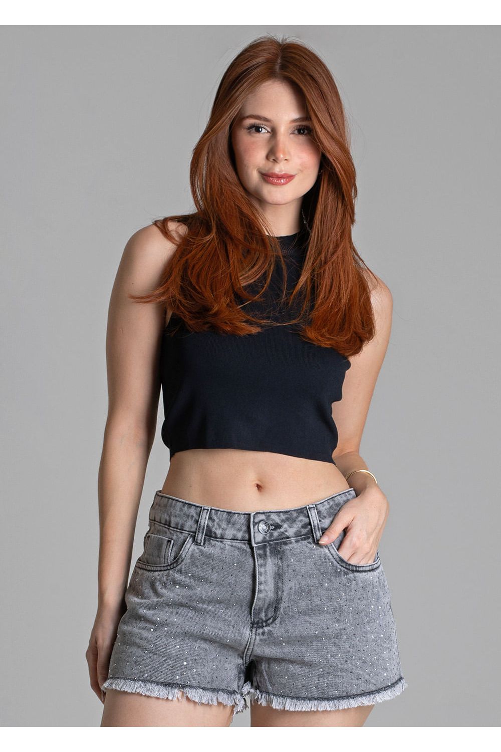 Short feminino desenvolvido em jeans A modelagem tem quadril soltinho. Bolsos frontais e posteriores funcionais O cós tem passantes e fechamento por zíper e botão A barra tem acabamento desfiado. Tecido: jeans Tipo de lavagem: marmorizada com strass Cor: cinza-