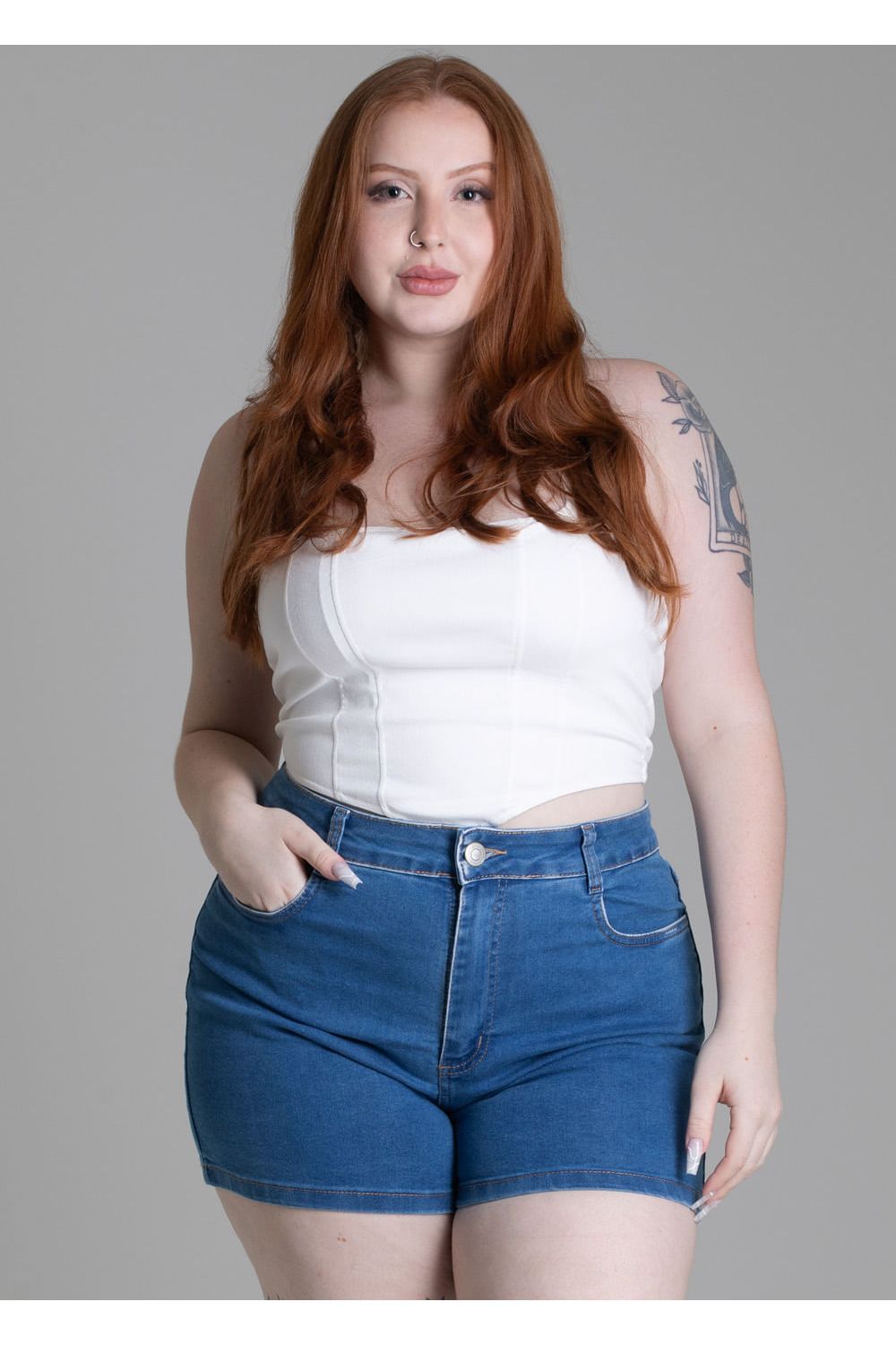 Shorts plus size confeccionado em jeans. Modelagem moderna e confortável para todas as ocasiões. Cintura média Fechamento com botão metálico e zíper Bolsos frontais e bolsos traseiros funcionais Barra simples Modelagem: Plus size Tecido: Jeans Tipo de lavagem: azul medio-