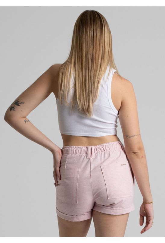 Shorts confeccionada em linho. Modelagem soltinho. Cintura alta Fechamento com botão e zíper Cós com aplicação de elastico e cordão Barra dobrada Tecido: Linho Tipo de lavagem: Color Cor: Rosa-