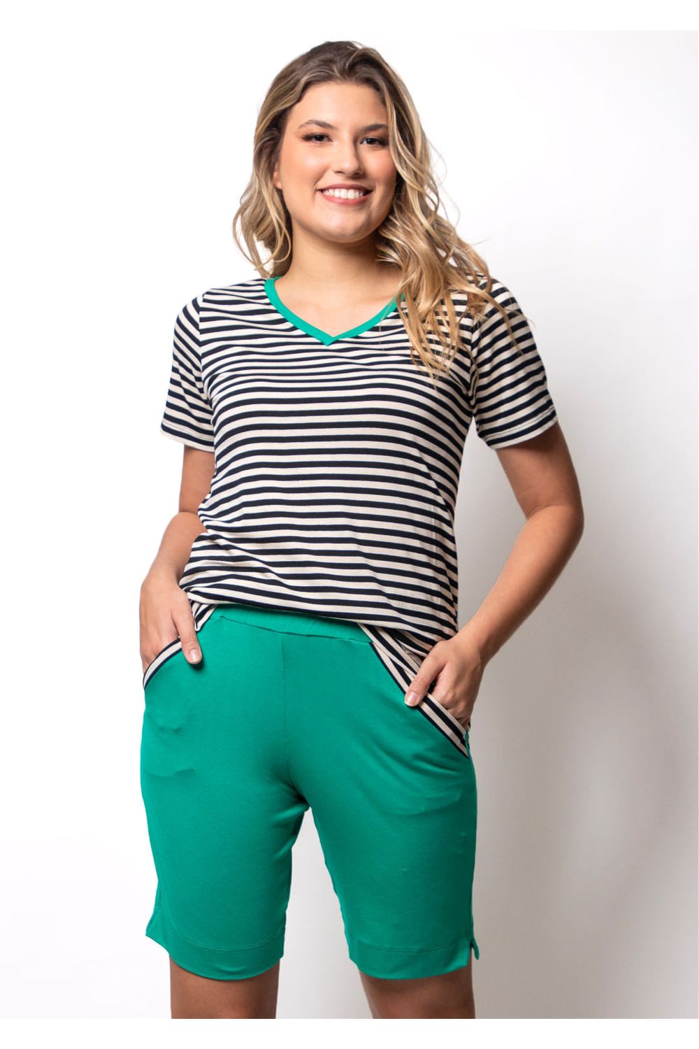 Possui elástico inteiro, 2 bolsos traseiros e dois bolsos frontais - com recorte listrado.