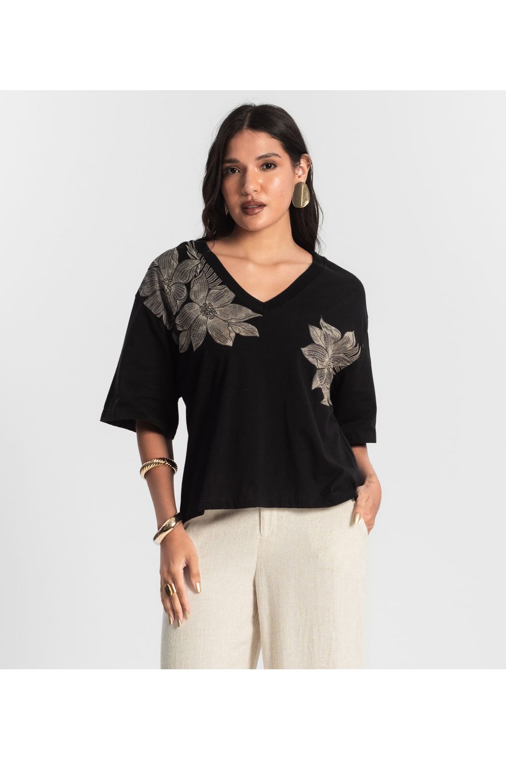 A T-Shirt Feminina Rovitex é confeccionada em Meia Malha, um tecido leve e respirável. O decote em V alonga a silhueta, enquanto os ombros deslocados e a manga ampla até o cotovelo garantem um visual despojado e sofisticado. O grande destaque da peça é a estampa localizada com efeito metalizado, que adiciona um toque de modernidade e brilho sutil. Finalizada com acabamentos em bainha, essa t-shirt é perfeita para compor looks estilosos e versáteis, combinando conforto e tendência.-