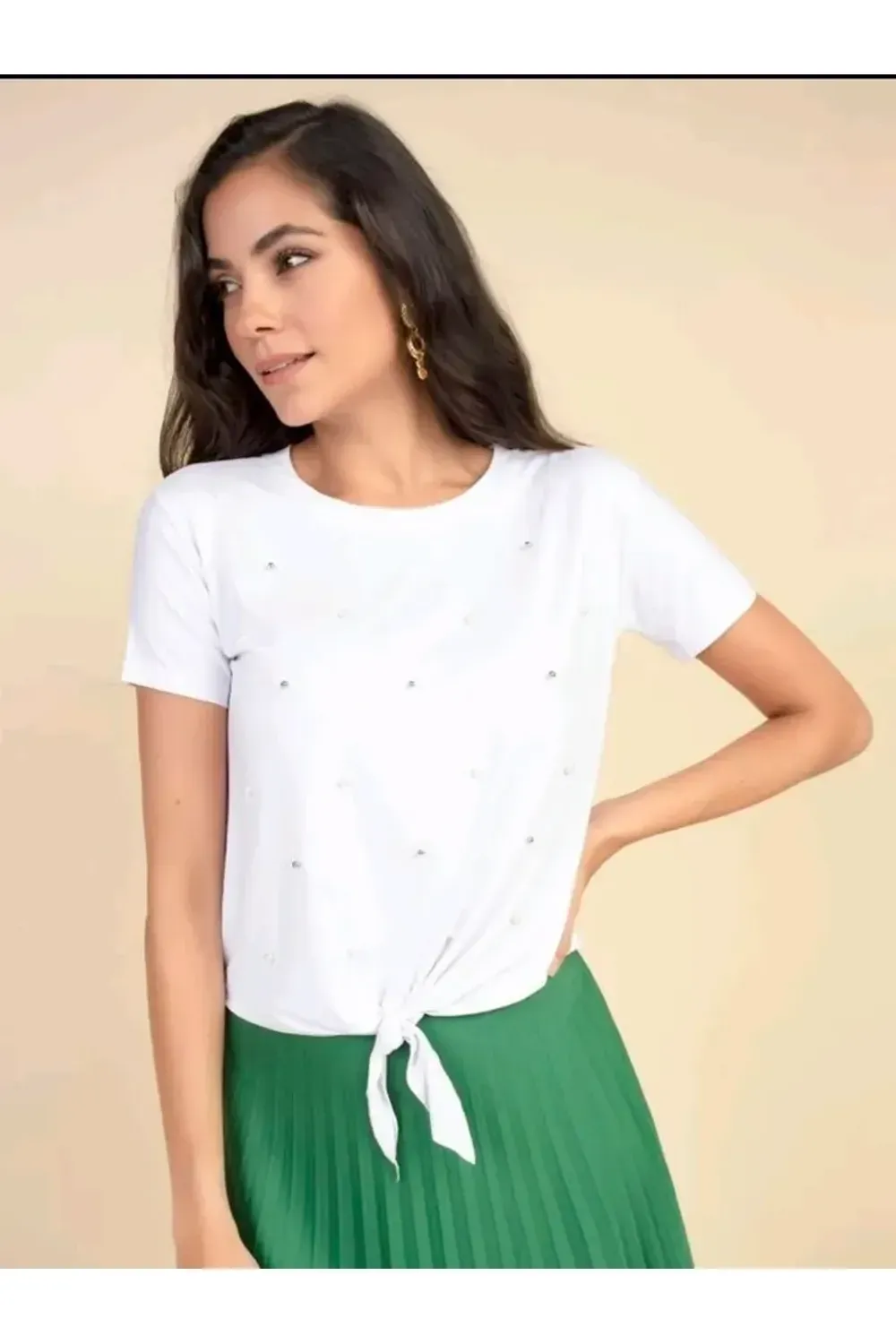nome: t shirt básica lisa femina laço amarrado na cintura com pérola