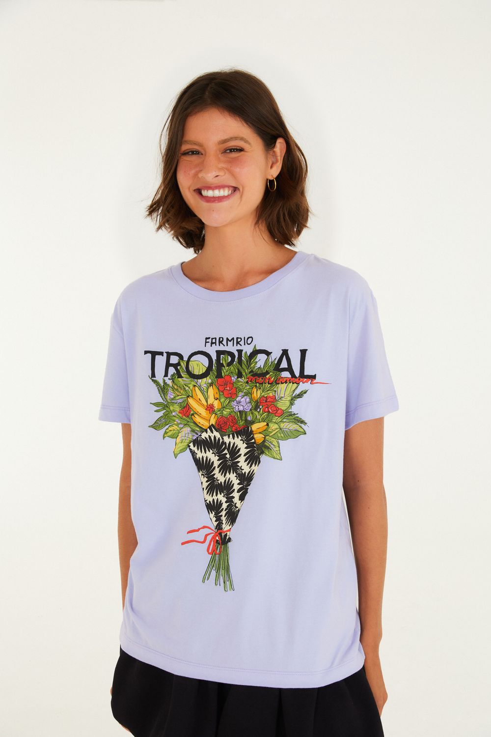 t-shirt fit bouquet tropical lilás wind. confeccionada em tecido leve, apresenta modelagem reta, decote redondo e mangas curtas, garantindo conforto e estilo. a estampa florida adiciona um toque de charme, ideal para compor looks casuais ou passeios ao ar livre. FARM RIO original - verão 26.-