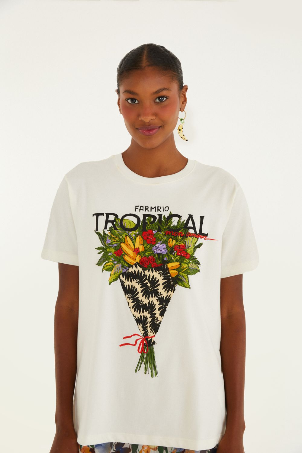 t-shirt fit bouquet tropical off white. confeccionada em tecido leve e confortável, esta peça traz uma modelagem clássica e atemporal para o seu dia a dia. com mangas curtas e decote redondo, é perfeita para compor looks casuais e descontraídos. o design único eleva qualquer produção. FARM RIO original - verão 26.-