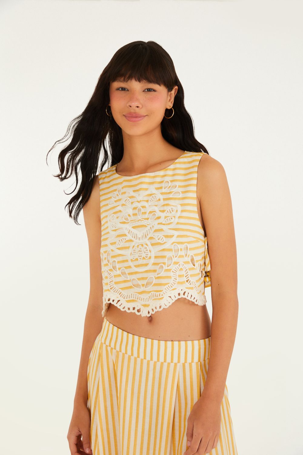 top bordado listra camponesa. elaborado em tecido leve com modelagem sem mangas, destaca-se pelo bordado detalhado na parte frontal, que traz um charme artesanal à peça. o corte cropped com barra levemente ondulada adiciona um toque casual. perfeito para dias ensolarados, combina com saias ou calças de cintura alta para um visual descontraído. FARM RIO original - verão 26.-