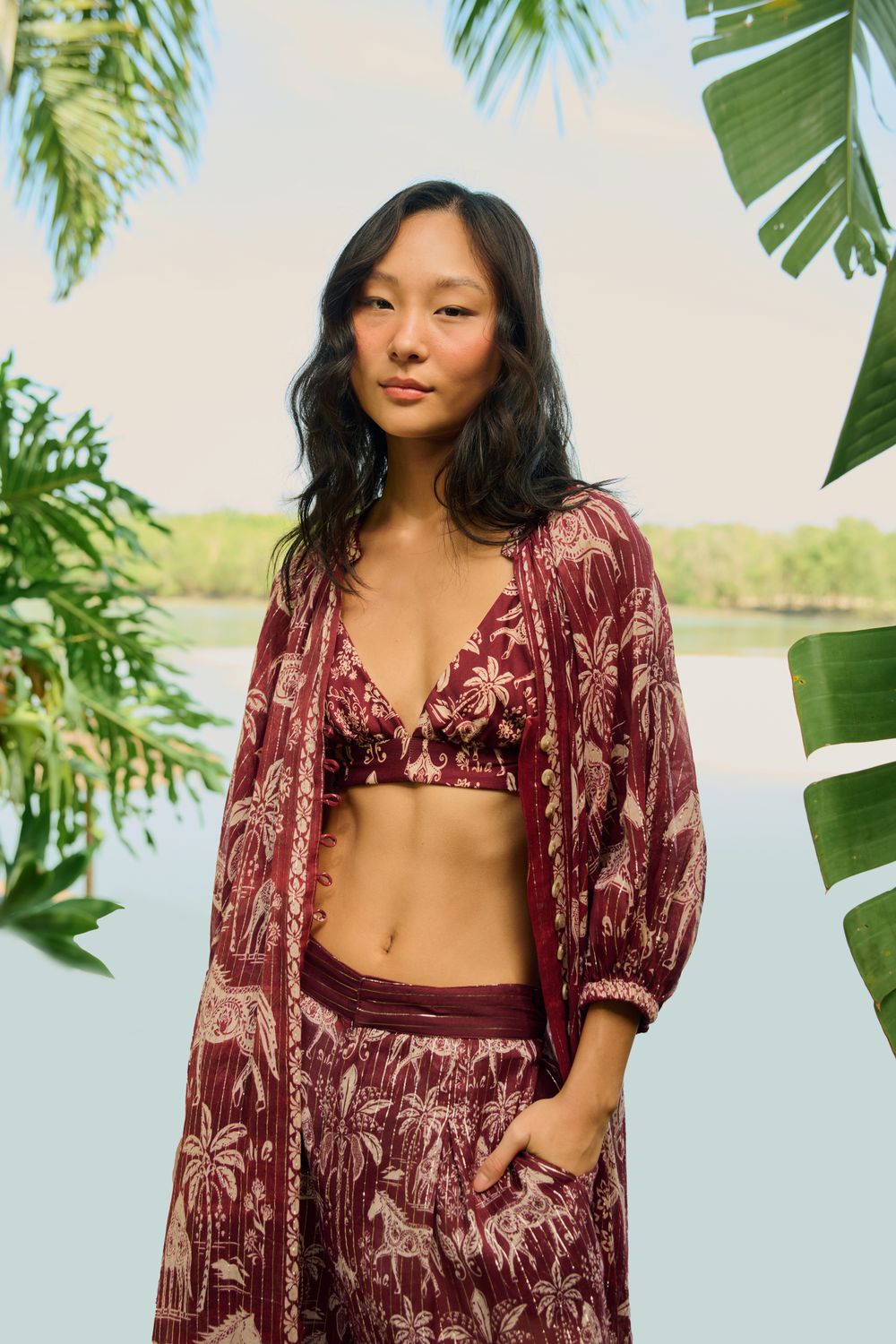 top estampado haras. com decote em v e alças ajustáveis que garantem conforto e versatilidade, é ideal para compor looks casuais e despojados. seu design único adiciona charme e originalidade, tornando-o perfeito para dias ensolarados ou momentos especiais. uma peça indispensável para suas combinações. FARM RIO original - verão 26.-