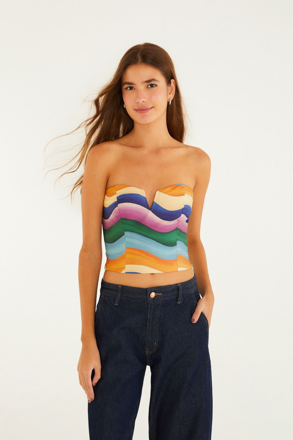 top montanha de tucano traz frescor e originalidade com seu design sem alças, que destaca os ombros. o decote em coração apresenta um recorte central, trazendo um toque moderno e charmoso. ideal para eventos casuais e encontros especiais, combina criatividade e conforto. FARM Rio, coleção Carioca - inverno 26.-
