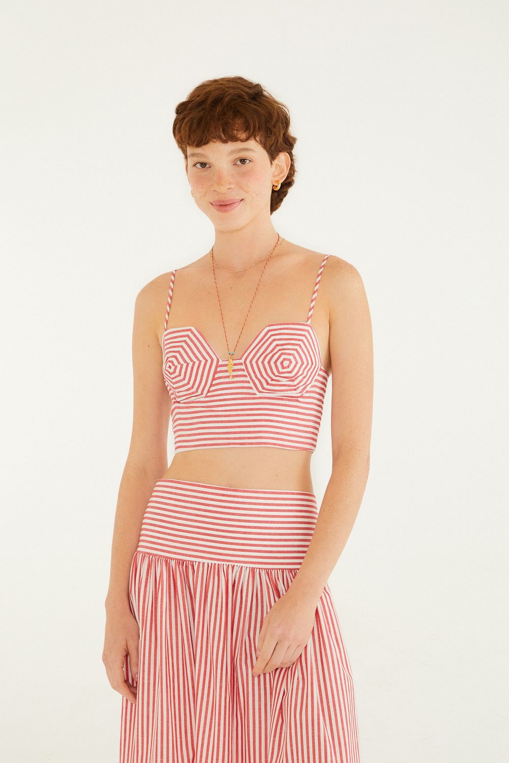 top listra palmas. possui alças finas ajustáveis e decote reto que traz leveza e modernidade ao visual. suas linhas e corte estruturado conferem personalidade. perfeito para combinar com saias, calças de cintura alta ou shorts em dias ensolarados, trazendo frescor e originalidade ao dia a dia. FARM RIO original - alto verão 26.-