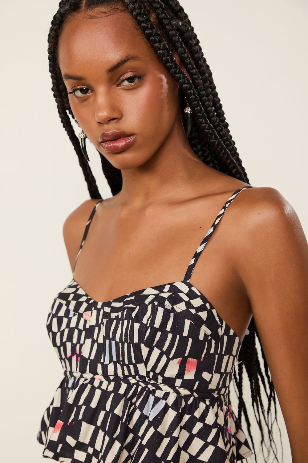 O Top Estampado possui decote coração, alças reguláveis, elástico nas costas e barra peplum. Uma proposta feminina e moderna.