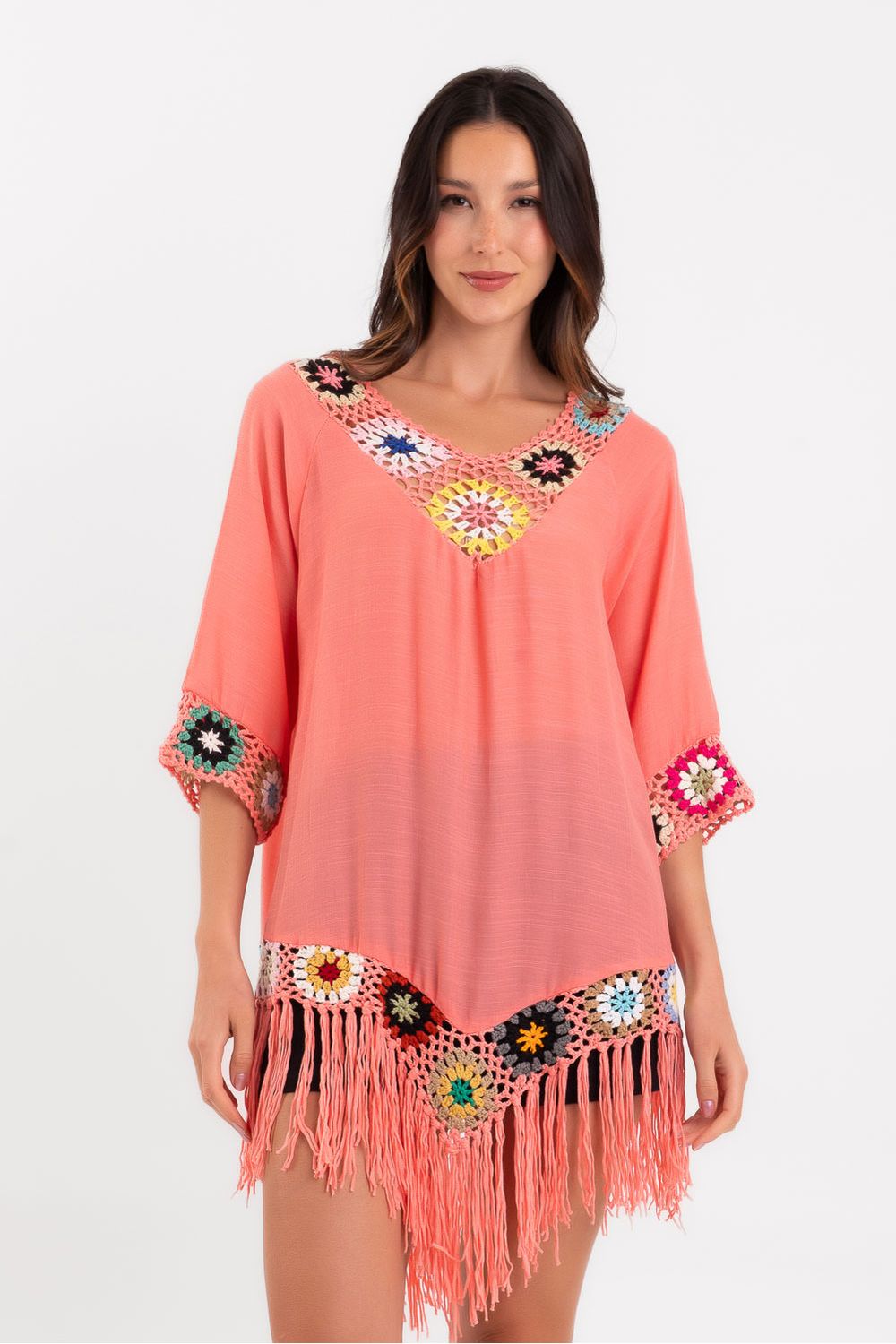 Túnica com franjas e acabamento em crochê salmon pequiá - U